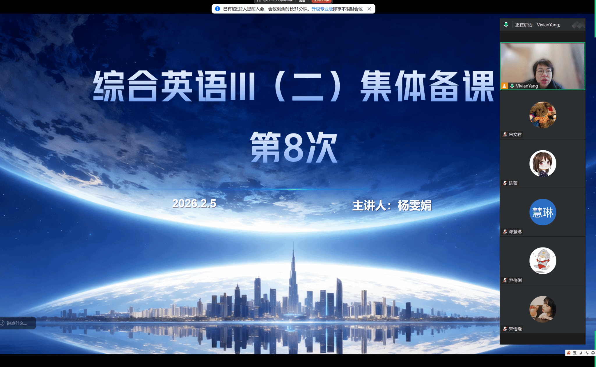 2026年2月5日上午,英语系于腾讯会议线上平台召开《综合英语III(二)》课程第八次集体备课会议。本次会议由英语系主任杨雯娟副教授主持,参会人员有英语系邓慧琳、宋文君、宋怡晓、尹伶俐老师和商务英语系陈蕾老师。与会教师围绕第三单元Reading II的教学内容展开深度研讨,着重探讨了如何将英语教学专业知识与教师资格证面试技巧相结合,以实现“以学促考、以考促教”的育人目标。