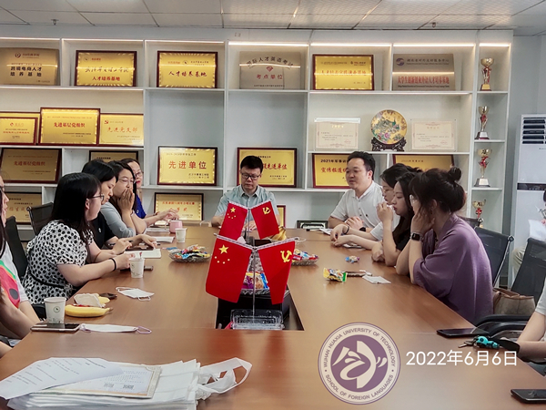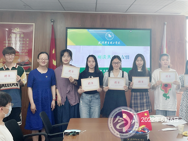 2022年6月6日上午8:30,外国语学院于综合楼1102会议室举行2022届毕业生座谈会暨校友联络员聘任仪式,本次会议由党总支书记马勇主持,外国语学院院长刘沛、副院长白燕琴、学工办主任鲁煜霖、英语系主任杨雯娟、商务英语系主任王春艳、教学行政办主任吴敏、党总支秘书陈卓、辅导员龚飞和梅钰博以及2022届毕业生优秀代表参会。