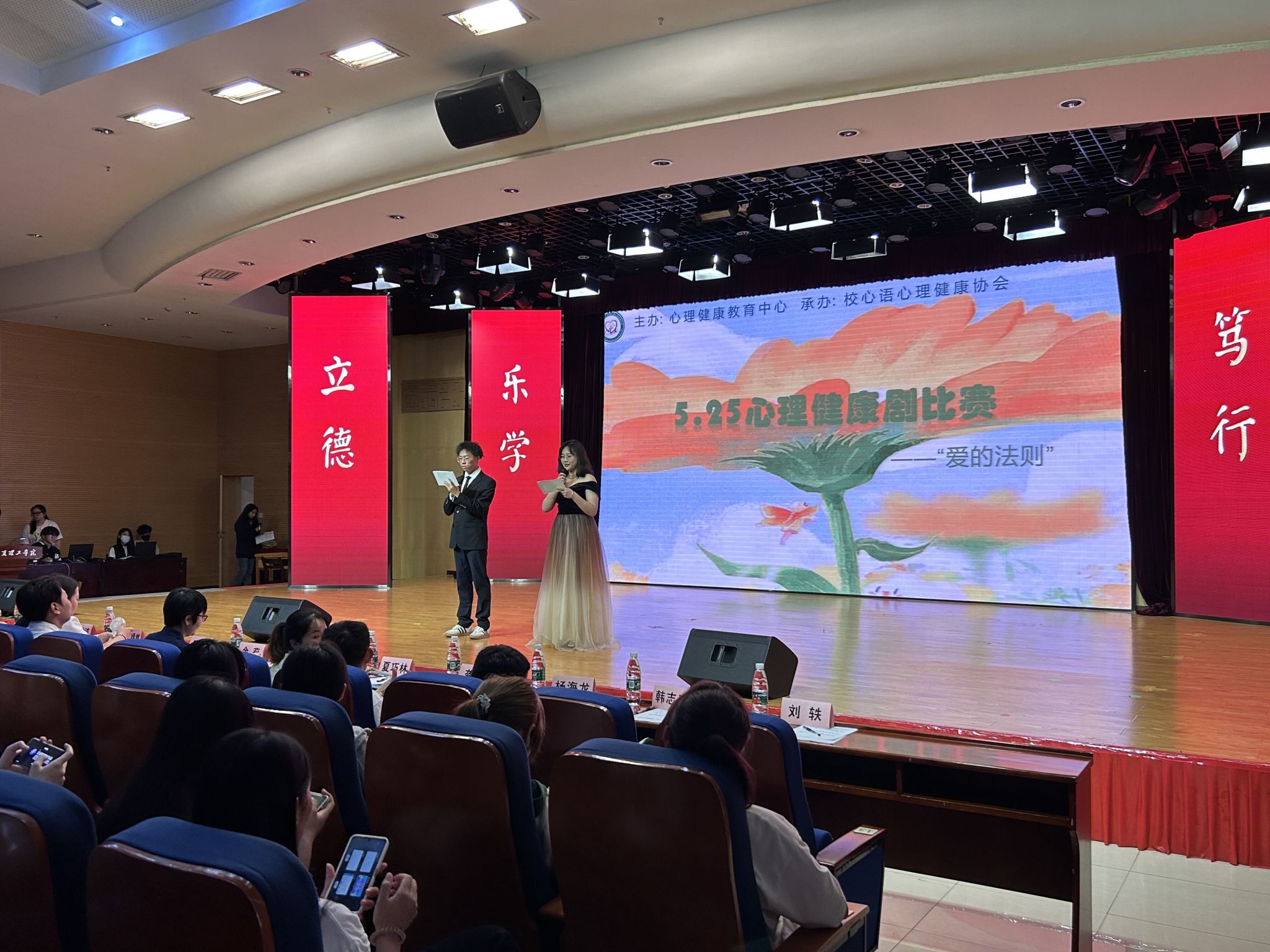 2023年5月24日晚,心理剧展演在beat365学术报告厅如期举行。艺术设计与传媒学院团总支书记陈军老师,各学院心理指导老师:龚飞老师、潘周熠然老师、夏巧林老师,杨海龙老师。学校心理健康教育中心主任韩志来老师、校心语心理健康协会指导老师余莉老师、刘轶老师、王雅洁老师、刘煜莹老师、刘紫萱老师出席了本次大赛并担任评委。同时,各学院心协部门的学生代表们担任观众。