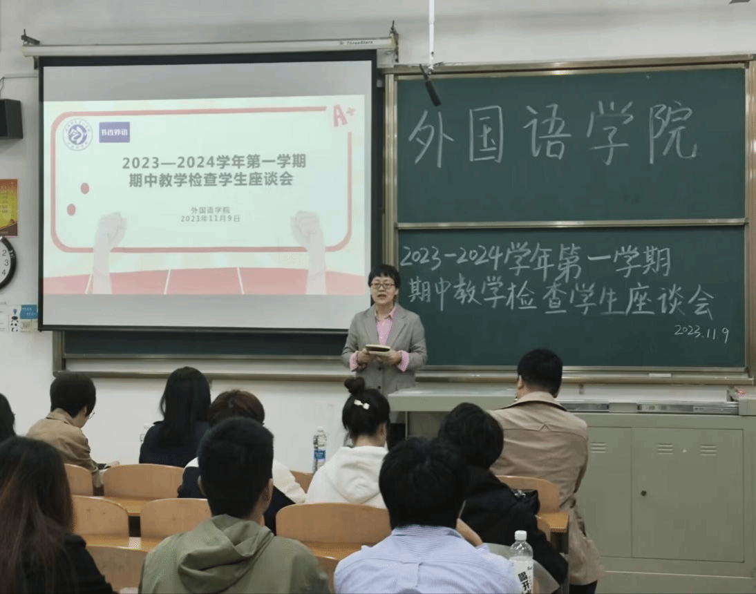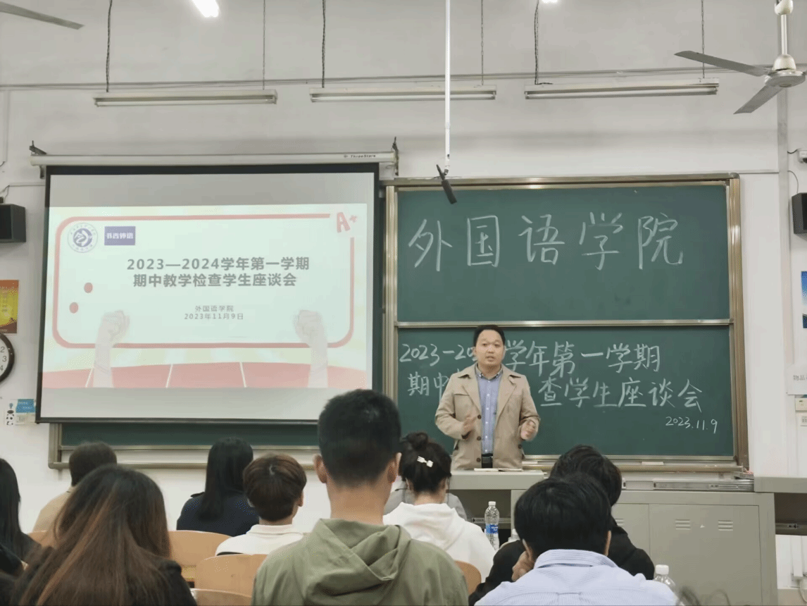 11月9日中午12:20,外国语学院在教学楼2-107召开了2023-2024学年第一学期期中教学检查学生座谈会,此次座谈会的目的是为了能够更好的辅助同学们的学习,并有效解决学生们在学习和生活上存在的问题。此次会议由党总支书记马勇主持,参会人员有外国语学院副院长白燕琴,党总支组织员陈卓,学工办主任杨洋,全体辅导员,学生代表参与此次会议。