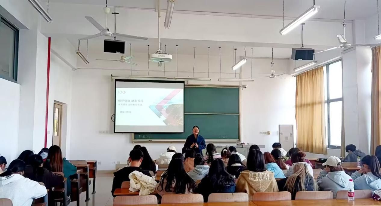 启动仪式结束后,晚上八点,学风建设活动正式开始。陈晶介绍了她眼中的冀欢欣:“我对她印象十分深刻,她上课积极,每次都坐前两排,和老师互动很多,她热爱专业,并且学习有目标。”并且详细地介绍了冀欢欣的优秀事迹:她加入了陈晶老师负责的华夏文旅工作室,之后成为了工作室学生负责人,并且十分有责任心;她获得过国才全国一等奖,至今全校无人超越。此外,陈晶讲述了商务英语专业的各种优势,并且介绍了考MBA必须要有商务经验,商英专业的同学有很大专业优势。