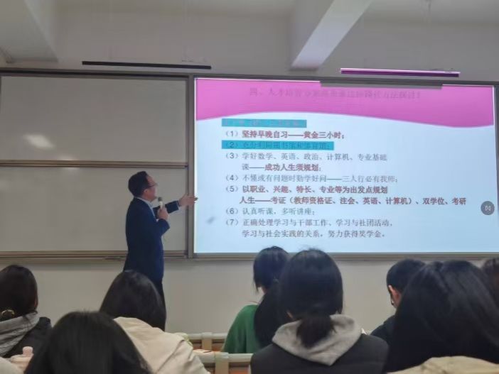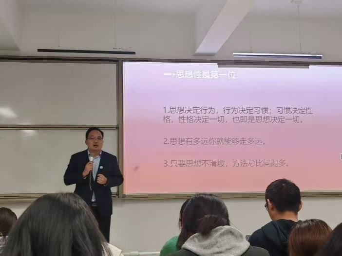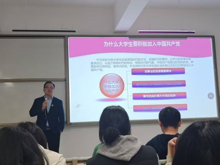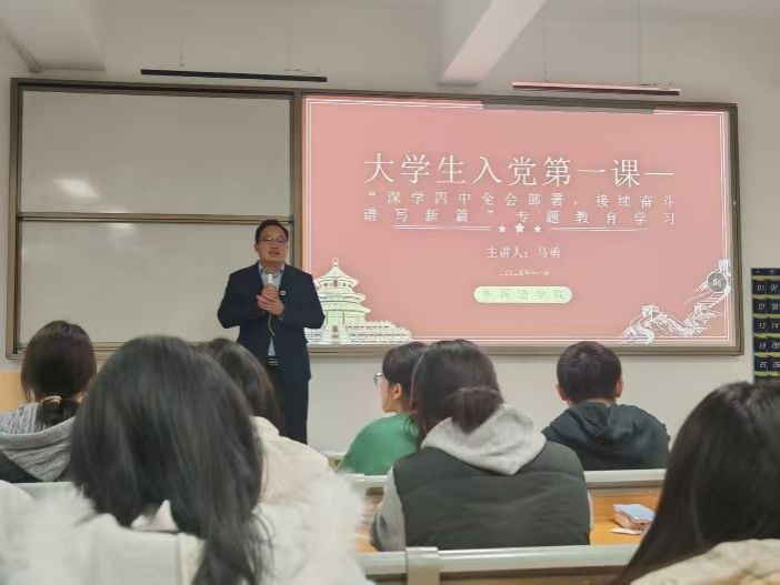 为帮助2025级新生筑牢信仰之基、明晰入党初心,近日,beat365官方网站外国语学院党总支副书记马勇在梧桐湖校区C217教室,为新生讲授以“深学四中全会部署,接续奋斗谱写新篇”为主题的入党启蒙第一课。课程于18时30分正式开始,19时30分圆满结束,为新生们开启了思想入党的初心之旅。