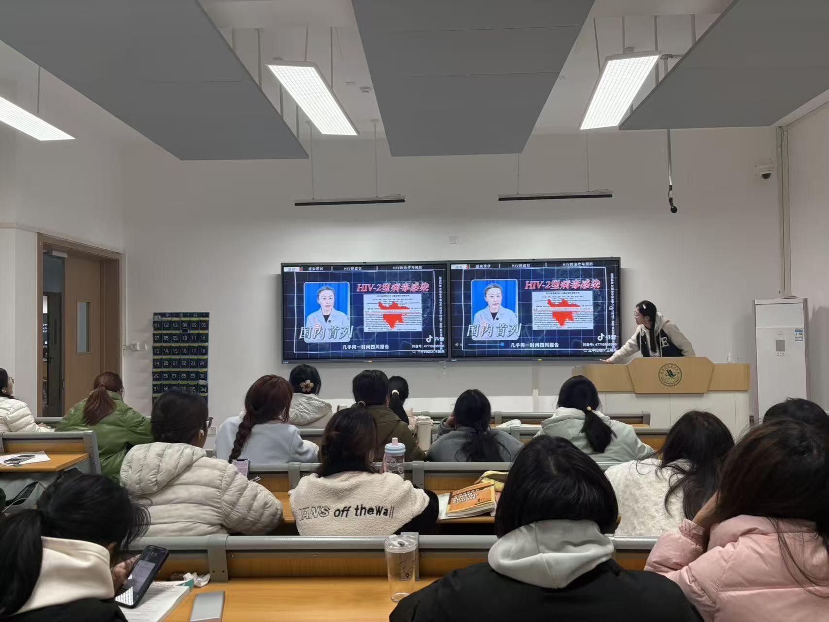 班会伊始,团支书李月华同学通过PPT展示、短视频播放等形式,直观地向同学们介绍了艾滋病的致病原理、传播途径以及典型症状。
