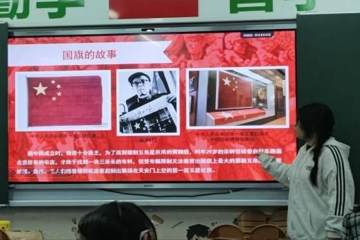 活动伊始,宣讲团通过“旗帜初识:猜猜乐”环节迅速吸引了学生们的注意力。PPT中“祖国旗帜我知晓”板块逐一亮相,党旗、国旗、军旗、团旗、队旗的图案依次呈现。主持人通过描述核心元素——“有镰刀和锤头”“有八一字样”等,邀请同学们踊跃抢答旗帜名称。现场气氛热烈,在轻松愉快的互动中,宣讲团成员结合PPT内容,简要讲解了每面旗帜的基本标识,使同学们对祖国旗帜有了初步认知。