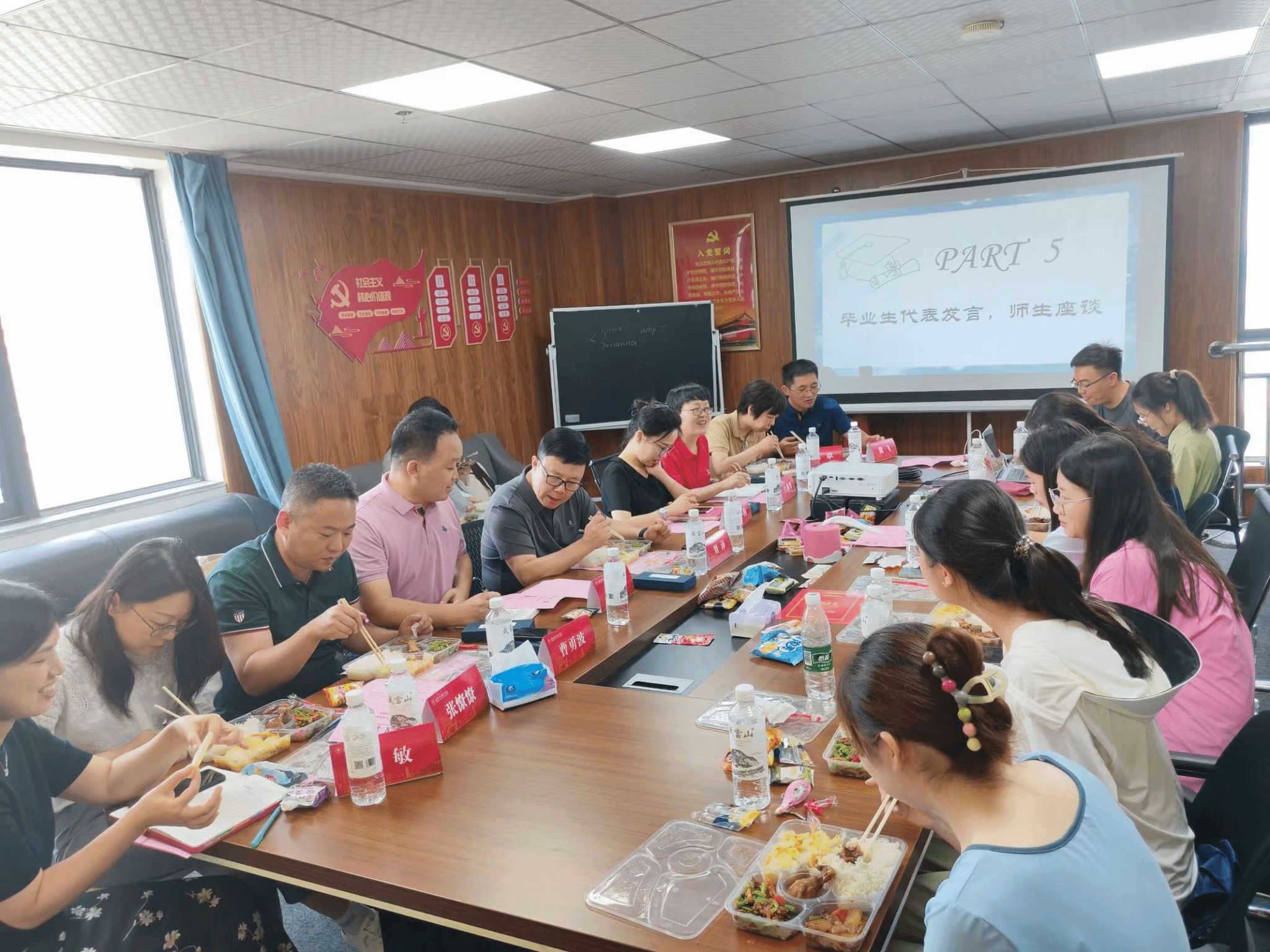 师生们在午餐时间讨论,在了解毕业生想法和期望的同时,也对毕业生们的表达深切的关怀。毕业生代表们也都纷纷提出意见和感悟,各领导认真进行意见记录,气氛温馨融洽。