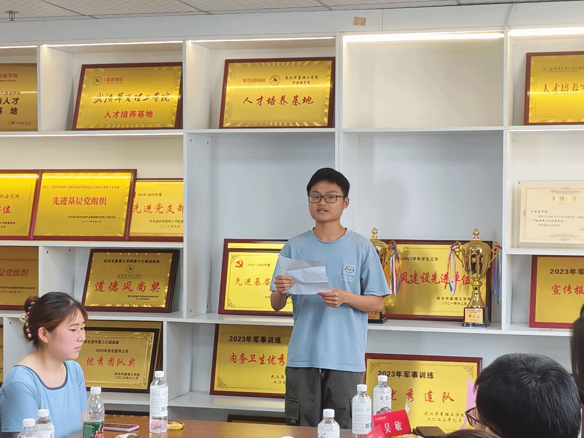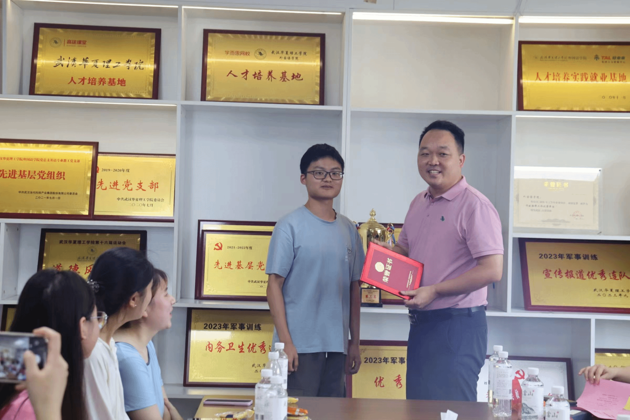 接着,毕业生代表向学院赠送毕业礼物。毕业生代表刘宗仁同学向母校致信并赠予礼物,代表各位毕业生向学院表达了深深的感谢和眷恋。紧接着,党总书记马勇老师接受礼物并为刘宗仁同学颁发荣誉证书。