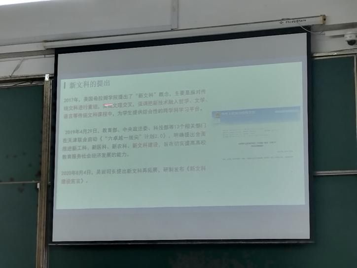 首先,王春艳老师向我们讲解了什么是新文科。新文科,就是基于现有传统文科的基础进行学科中各专业课程重组,形成文理交叉,即把现代信息技术融入哲学、文学、语言等诸如此类的课程中,为学生提供综合性的跨学科学习,达到知识扩展和创新思维的培养。简单来说,新文科最基本的特点就是综合性和实用性。