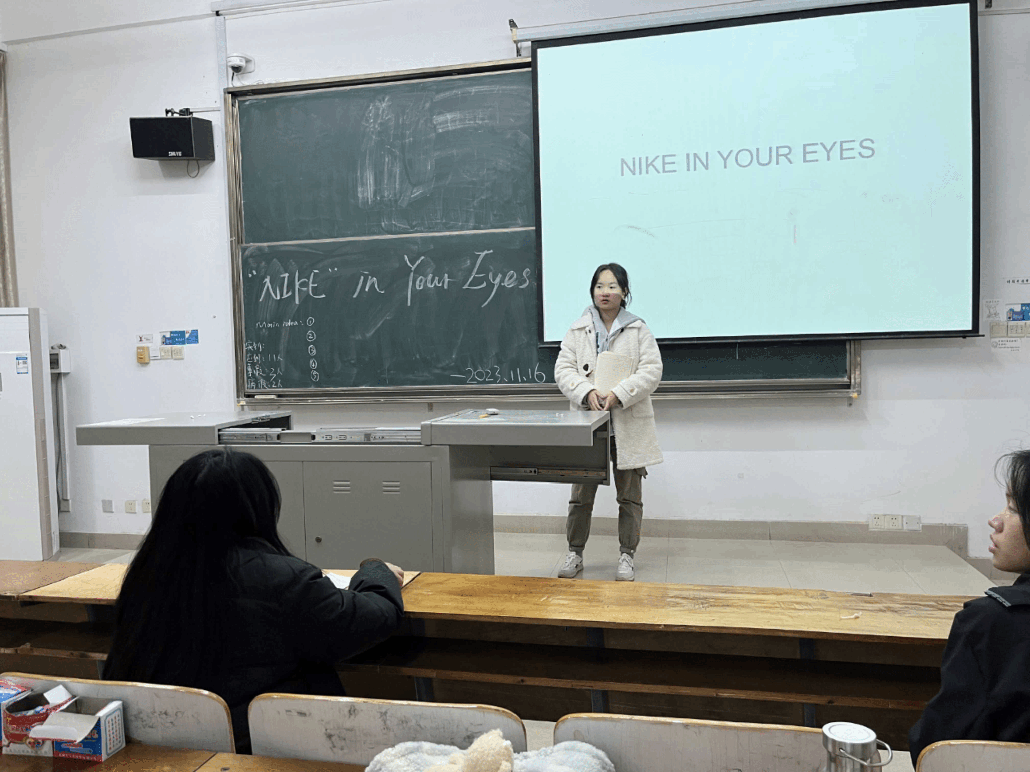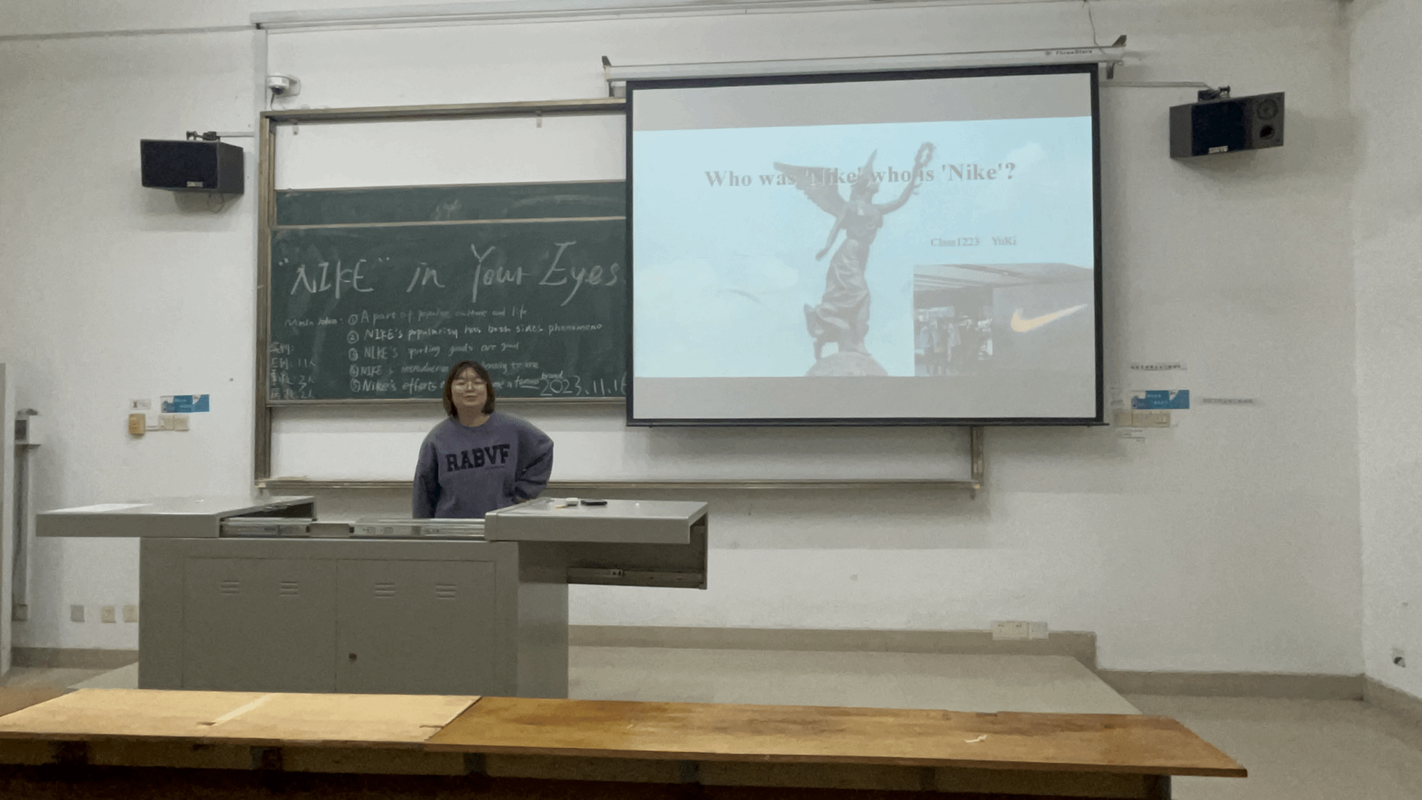 2023年11月16日星期四晚上八点二十,由英语演讲社社长朱茹洁和副社长张敏组织社员们在教学楼3—203教室举行了本周的英语演讲活动。此次活动共计5位社员参加,每位社员都发表了对NIKE的见解。