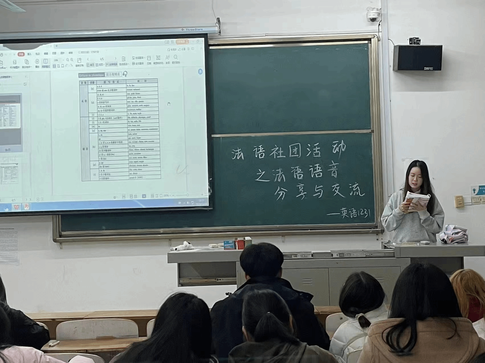 2023年11月15日,外国语学院法语社团在三栋教学楼的202教室举行了为时一个多小时的法语语音分享会。此次分享会是由大三的学姐们为大一新生做一个法语语音的教学和技术分享。学姐们都是在法语学习方面非常优秀以及有天赋、有学习方法的人。她们从单词教学起,让大一新生们感受到法语的魅力,与同学们互动,让同学们读法语句子,这为后期大一的同学们学习法语奠定了一个良好的基础。