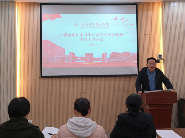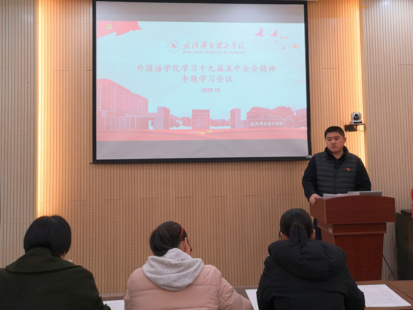 2020年12月25日13:00在综合楼一楼远程招聘厅举行了外国语学院党总支学习十九届五中全会精神专题会议。参加会议的有党总支书记马勇,党总支委员,各支部书记,全体辅导员。