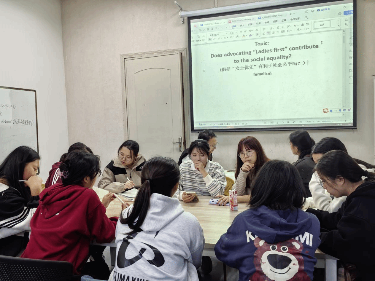 在一系列的准备活动完成后,部长向成员们播放了关于女性主义的一段视频,使成员们了解女性主义的意思,分类以及影响,随后播放艾玛·沃森在联合国为女性现状发声的片段,引出此次话题讨论的主题。“Does advocating "Ladies first" contribute to the social equality?”经过成员们五分钟的思考后,部员们被分为三组,分别和三位副部长一起共同讨论自己的观点。大家激烈地讨论着,正方认为此项政策帮助在困境中的女性生存并找到工作,反方则有同学认为,从长期看这并不能解决女性的困境,反而加重社会不平等的现象等。三位副部长也总结归纳了成员的观点。最终由副部长赵祎晴来补充大家没有讨论的观点,以及相关英语表达。