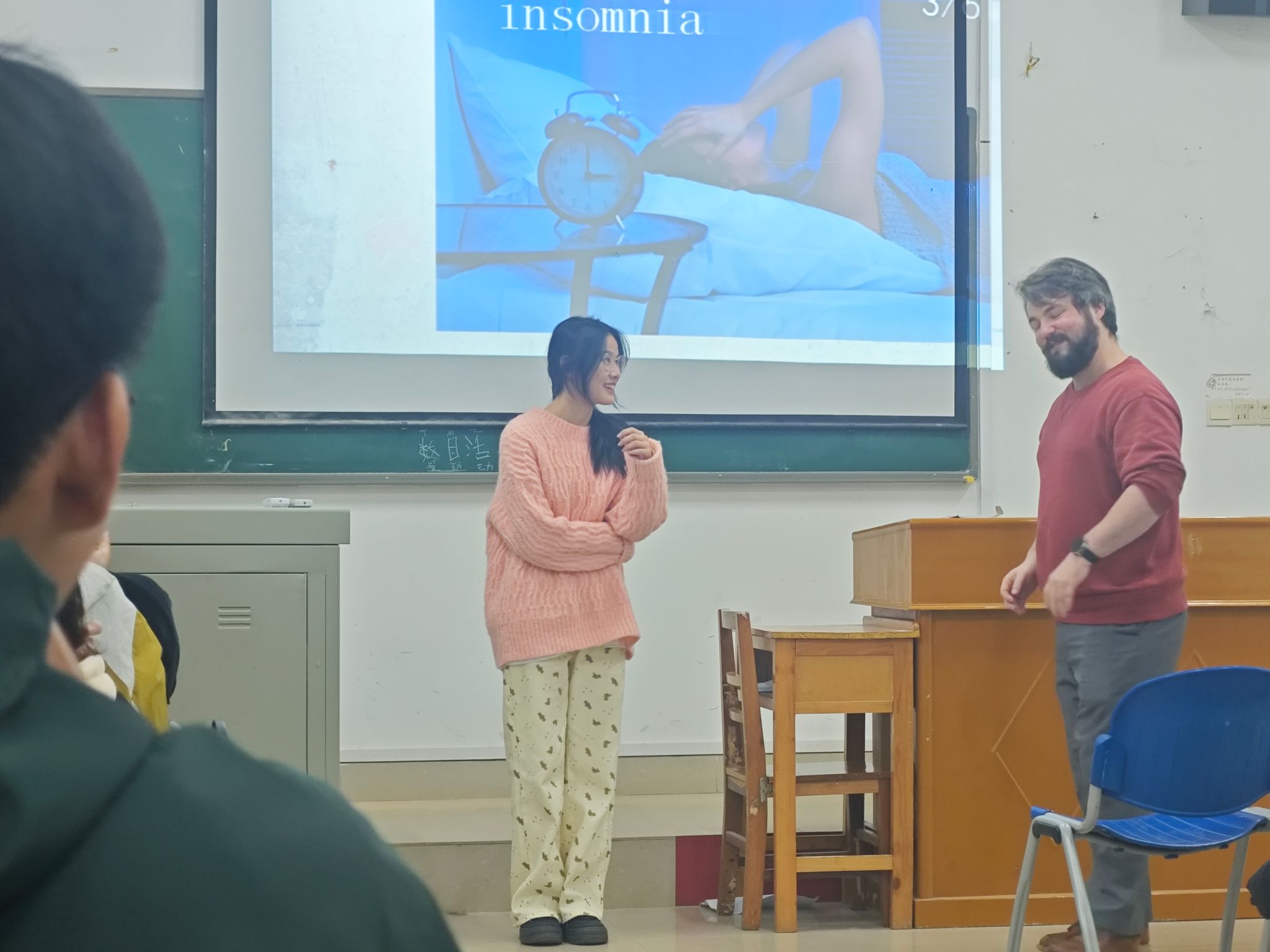 活动开始外教首先进行了简单的自我介绍与规定阐述,然后以一些简单的问题开启话题。同学们就这些问题分享了日常生活中助眠的方法、晚上最晚睡觉的时间与自认为必需的睡眠时长。同学们积极参与,创意性地提出了很多想法,一些同学通过听白噪音等音乐助眠,有的同学通过喝牛奶、洗热水澡来助眠。人体所需的睡眠时长并非固定,针对不同人的不同时期或许都有差异,我们身体需要休息多久就依此制定合理的睡眠时间。