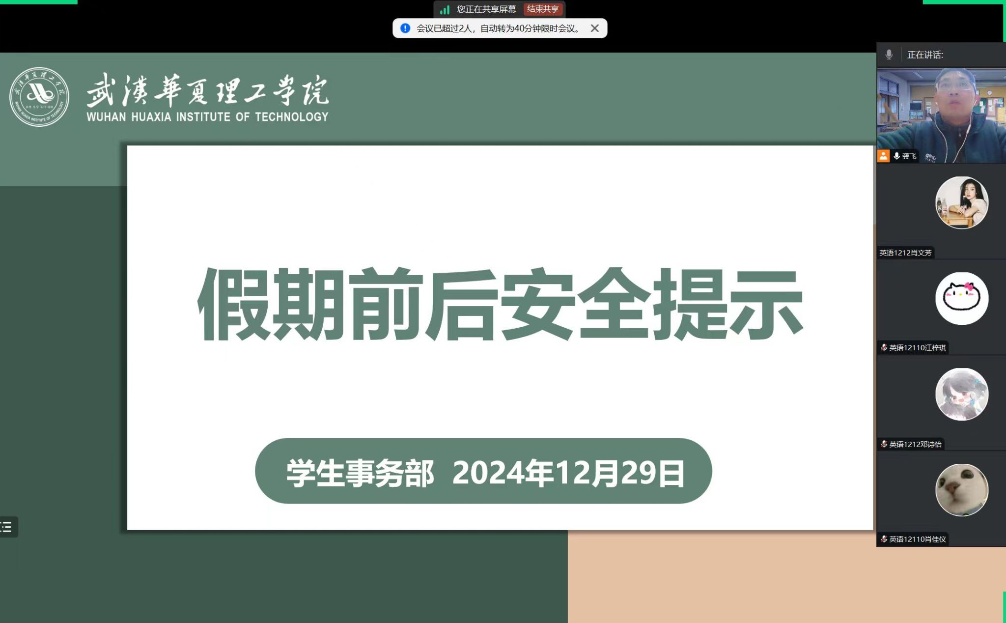 假期的脚步日益临近,为筑牢假期安全屏障,提高学生安全意识,外国语学院积极开展了“假期安全教育”主题晚点评,本次会议由24级辅导员王欣佳与毕业班辅导员龚飞通过线下和线上的形式进行开展。