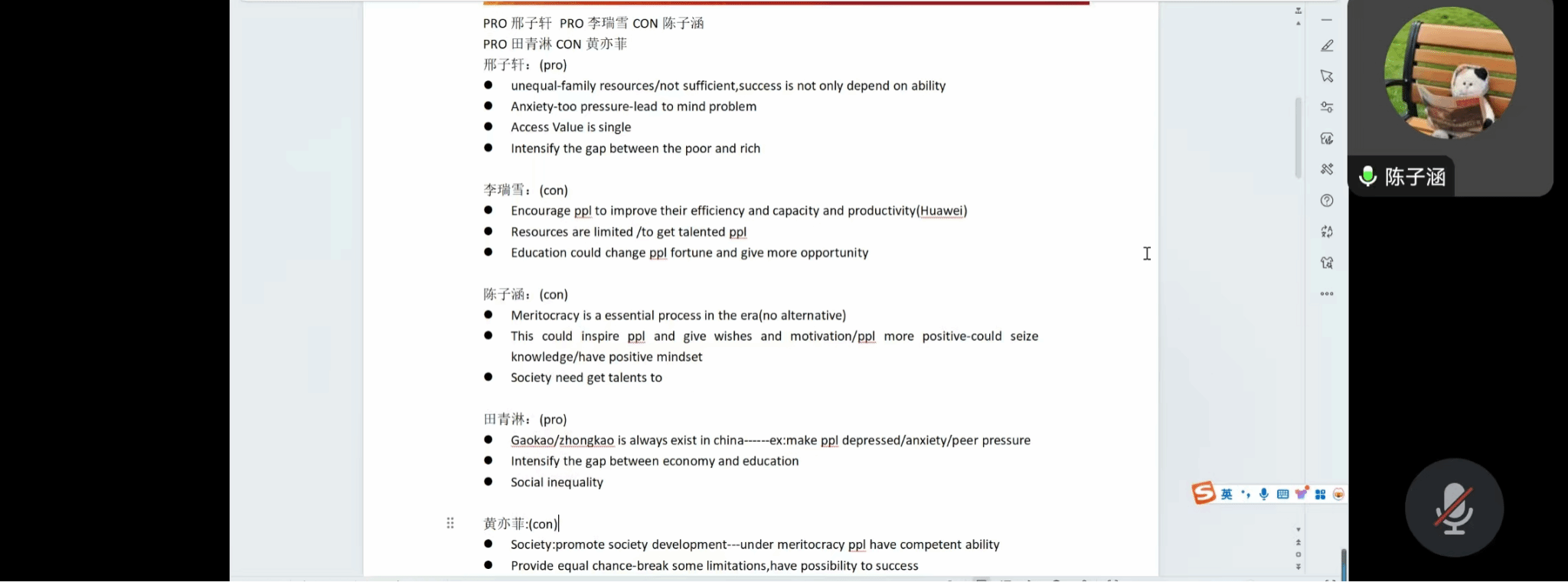 随后部员们利用五分钟的时间准备英文发言,正方谈论到优绩主义使社会内卷加重且容易引发焦虑情绪,从成功的现实性角度提到优绩主义并不完全公平,因为个人的财富和积累不同。反方提到优绩主义可以鼓励人们勇敢追求梦想,激励人们努力工作,为未来创造机会,为企业提升效率,为国家创造人才等观点。最后部长也总结归纳了成员的观点。