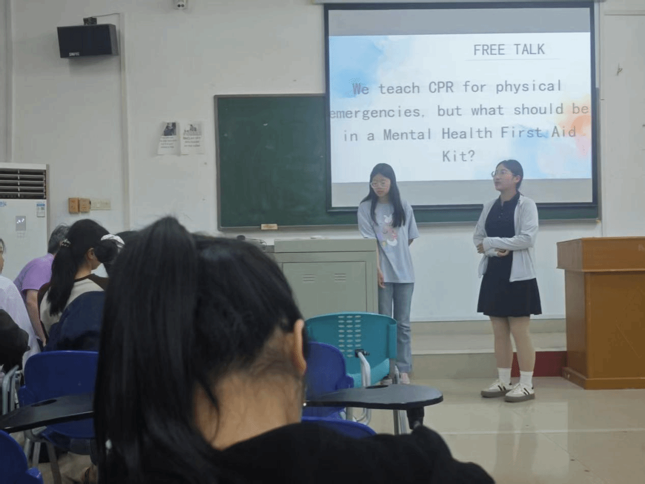 紧接着的自由讨论环节,主题为 “We teach CPR for physical emergencies,but what should be in a Mental Health First Aid Kit?”。对此大家各抒己见。有人认为,保持规律运动和健康饮食是维护心理健康的基石,运动能释放压力,食物能提供稳定情绪所需的营养。也有人觉得,培养兴趣爱好和与他人建立深厚的情感连接至关重要,兴趣爱好能让人专注享受快乐,亲密的人际关系则提供强大的社会支持。参与者们依据自身经验和观察,用英语热烈讨论,在思维碰撞中不断深化对维护心理健康方法的认知。
