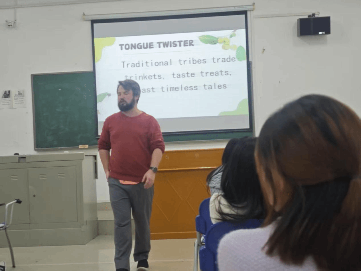 在轻松愉快的氛围里,活动推进到语言趣味挑战环节。主持人引领大家挑战绕口令,例如 “Traditional tribes trade trinkets, taste treats, toast timeless tales” 一开始,有人念得磕磕绊绊,惹得众人忍俊不禁。但随着反复尝试,越来越多的人能够快速且准确地念出,现场充满欢声笑语。