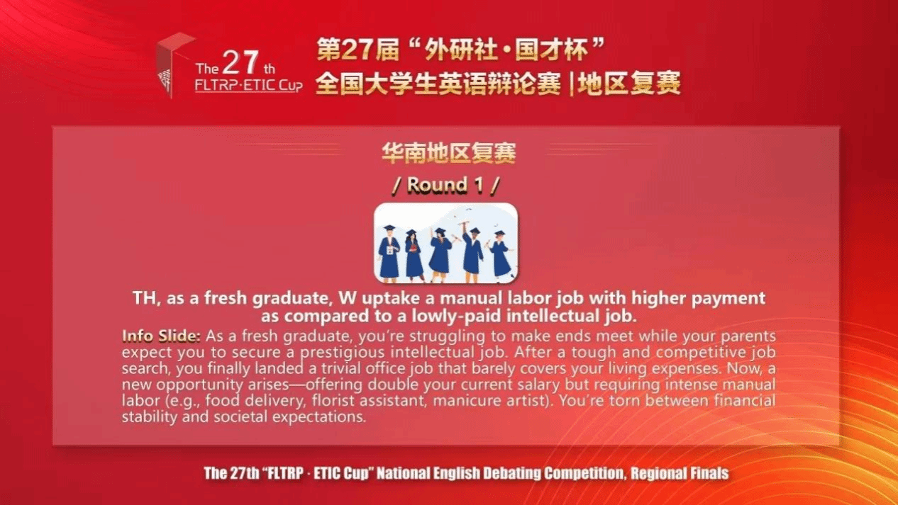 此次比赛的辩题涉及经济、哲学、政治、科技等各个方面。辩题内容包括“作为一个刚毕业的大学生,与低薪脑力工作相比,我们是否更偏向一份高薪体力工作”;“是否反对‘玄学’的流行”;“是否认为抖音难民涌入小红书利大于弊”;“是否反对finfluencers的崛起”;“是否支持一个科技乐观主义胜过科技悲观主义主导的世界”等。