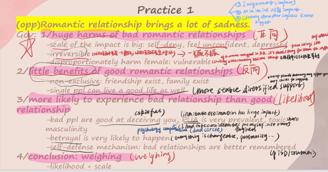 社长袁梦围绕“Romantic relationship brings a lot of sadness” “TH Regrets the belief that forgiveness is a virtue.”等经典辩题为切入点,深入解析比较性论证的逻辑框架与攻防策略。通过案例拆解与互动问答,引导成员突破单一视角,从“损益权衡”“替代性方案”“社会现实关联”等维度构建论点,显著提升了论证的深度与说服力。
