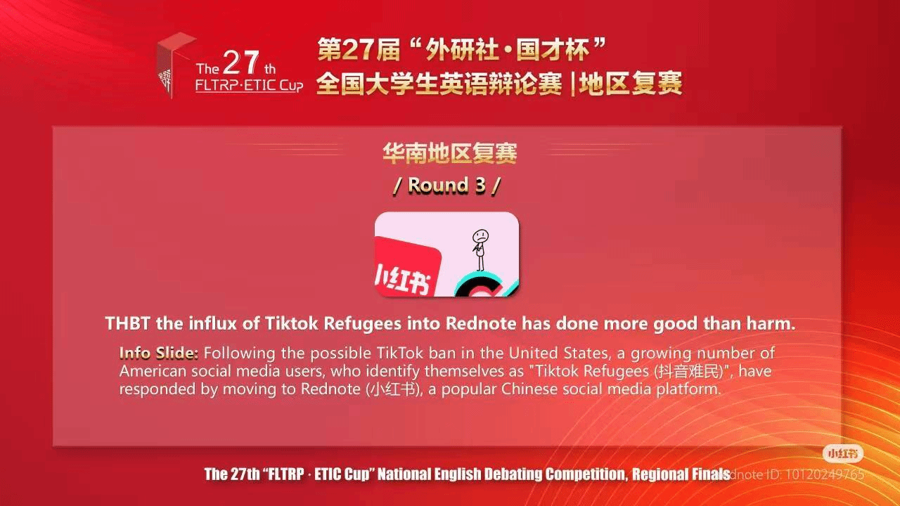 为了让理论更好地与实践结合,主讲人播放了一段关于“抖音难民进入中国小红书”事件的视频,以此为切入点引出辩题。视频从多个角度展现了这一现象及其引发的社会讨论,为后续的辩论分析提供了丰富素材。