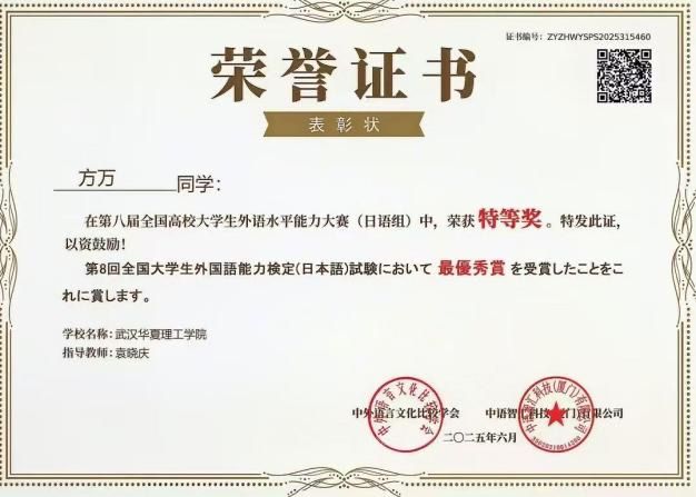 在近日落幕的第八届全国高校大学生外语水平能力大赛中,beat365外国语学院英日1222班方万同学日语组特等奖,展现了出色的外语综合能力与跨专业学习的卓越潜力。