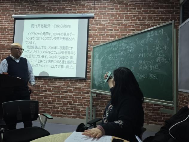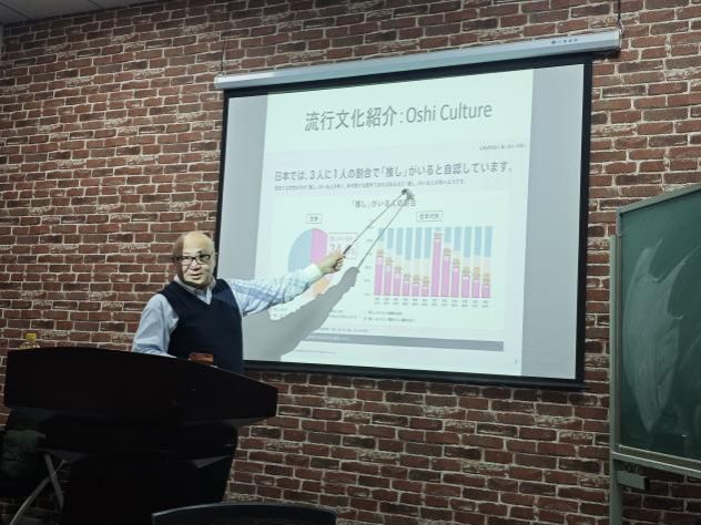 活动伊始,宫坂老师以“为什么学习日语”为切入点,引发在场学生的热烈讨论。当谈及“因喜欢动漫而学日语”这一常见理由时,老师分享了一组有趣数据:日本现有34.6%的人拥有“自推”(偶像或喜爱的角色),而青少年群体中这一比例更是高达83.3%,瞬间拉近了与学生的距离。