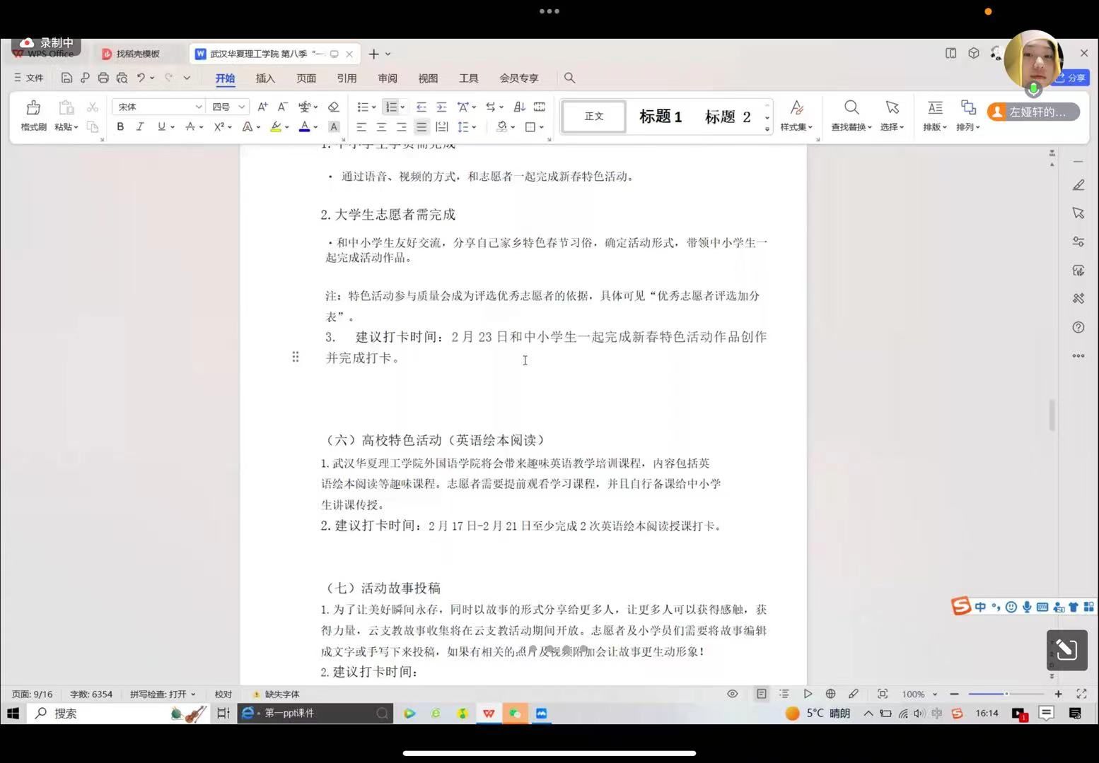 会议一开始,副领队左娅轩先对活动内容、安排简要做了说明,让志愿者们对各项工作的大概时间安排有了初步的了解。接着,副领队左娅轩向大家详细介绍了此次“一起云支教”的七项系列活动,从而让志愿者们对各项活动的具体安排有更加深入的了解。在“一起健康运动”活动中,大学生志愿者要与中小学生共同运动,并制作打卡记录表来记录双方的打卡情况。在“一起快乐阅读”活动中,大学生志愿者与中小学生分别选择一本书进行阅读,需通过通话、视频等方式交流分享所读内容,并在最后完成一份读书心得。在“一起云讲堂”活动中,大学生志愿者与中小学生要及时观看直播课程并选择双方共同感兴趣的录播课程进行学习。同时大学生志愿者需要进行腾讯会议云录制来进行活动打卡。在“一起云研学”活动中,大学生志愿者和中小学生各自寻访并介绍家乡的发展变化、红色文化、历史典故等,并在活动结束后共同完成一份“我心中的祖国”作品。在新春特色活动中,志愿者与中小学生至少需通过语音、视频的方式完成两项特色活动。在我院“英语绘本阅读”特色活动中,志愿者需提前观看学习课程,并自行备课给中小学生进行传授。在“活动故事投稿”活动中,志愿者及中小学生需以故事的形式记录下彼此之间的美好瞬间并进行编辑和投稿。同时,副领队左娅轩指出,志愿者们最好在建议打卡的时间段内完成这七项活动的打卡。