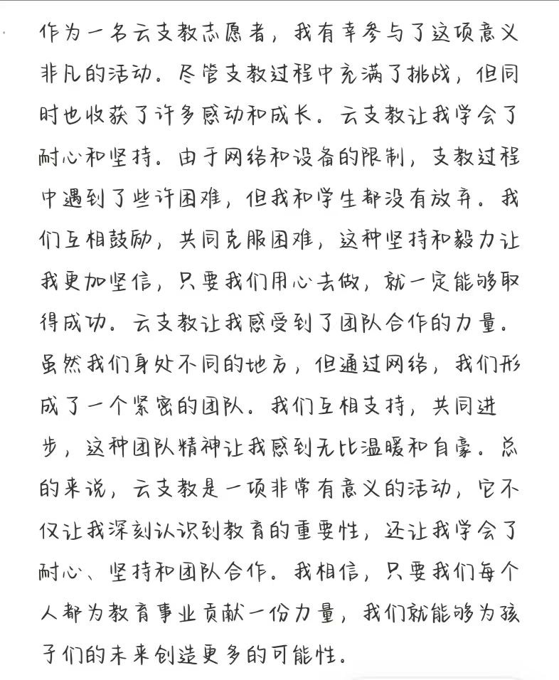 活动结束后,我院“一起云支教”执行团队也收到了许多志愿者与中小学生的反馈。他们纷纷表示,通过参加“一起云支教”活动,不仅收获了知识、成长和友谊,更感受到了社会的温暖与关爱,这段宝贵的云支教经历和回忆,将成为他们人生中难忘的篇章。