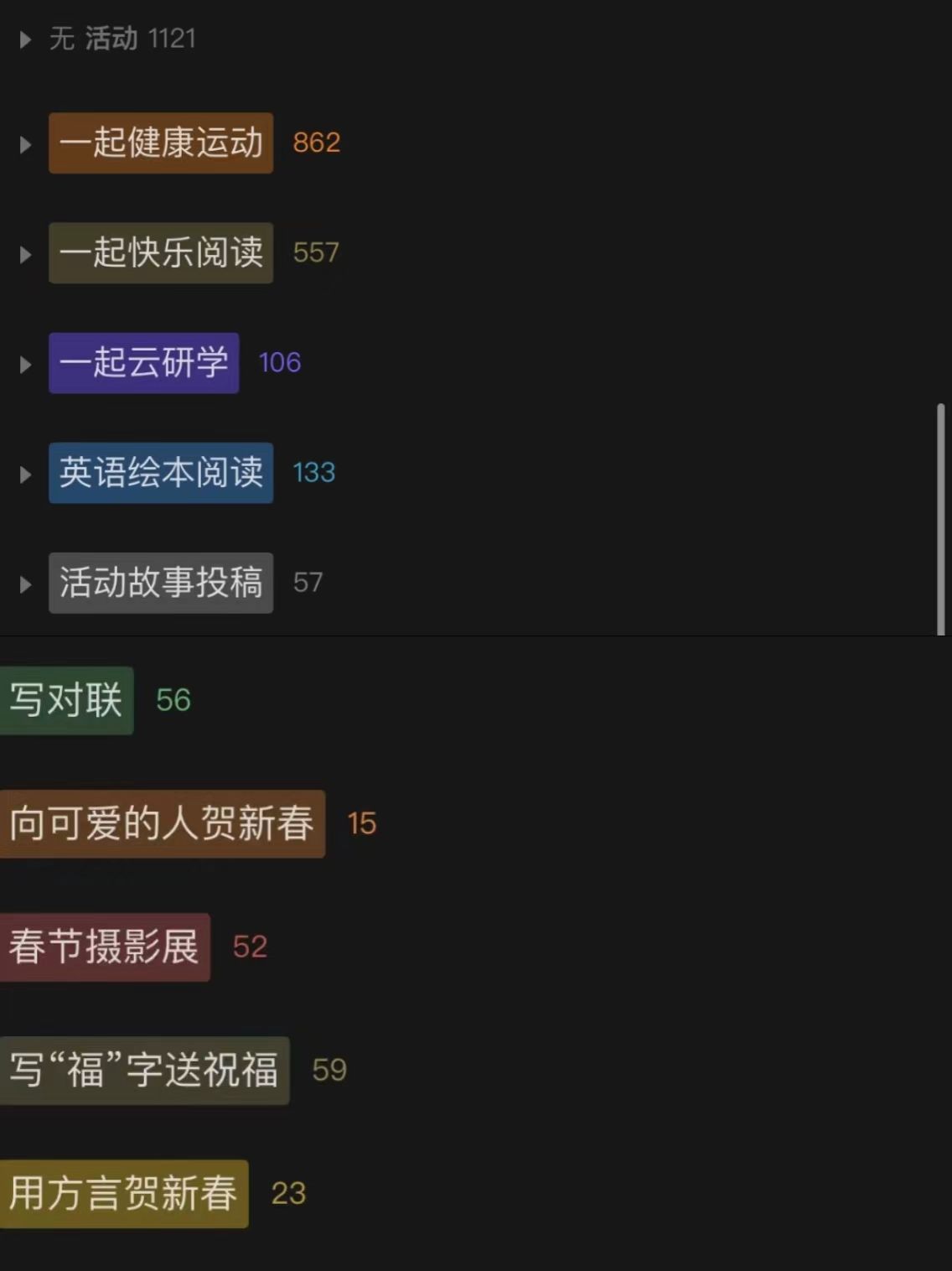 在本季活动中,我院志愿者带领中小学生们组织开展了“一起健康运动”、“一起快乐阅读”、“一起云讲堂”、“一起云研学”、“新春特色活动”、“高校特色活动(英语绘本阅读)”和“活动故事投稿”七项活动。大学生志愿者带领中小学生共完成了862次运动打卡、557次阅读打卡、1121次云课堂打卡、106次云研学打卡、133次英语绘本阅读打卡和57次活动故事投稿打卡,累计志愿时长达3937小时。