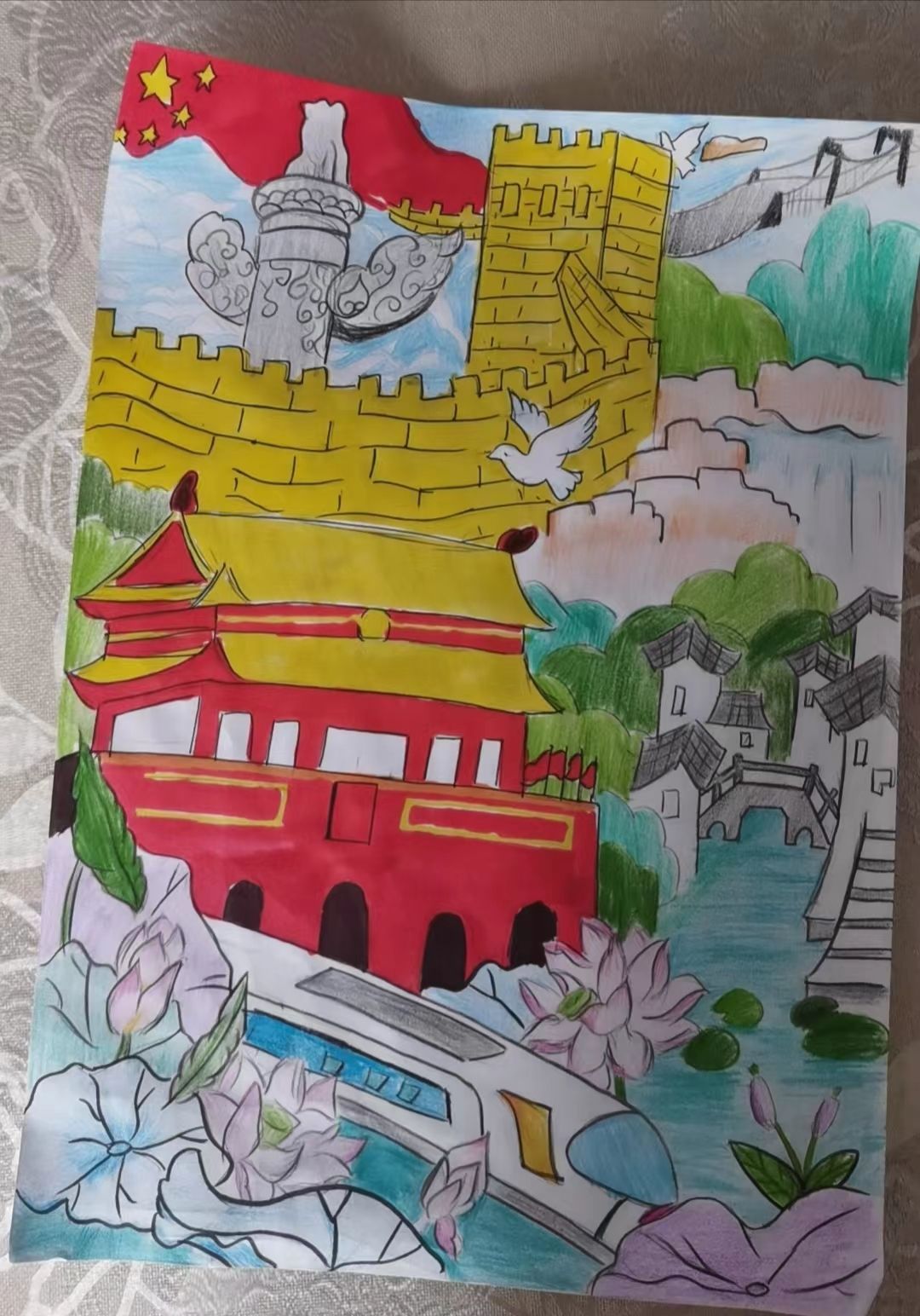 还有一个活动是“一起云研学”,我们通过打腾讯语音的方式分别讲述了家乡的变化,还一起绘制了主题为:《我心中的祖国》的一幅画。