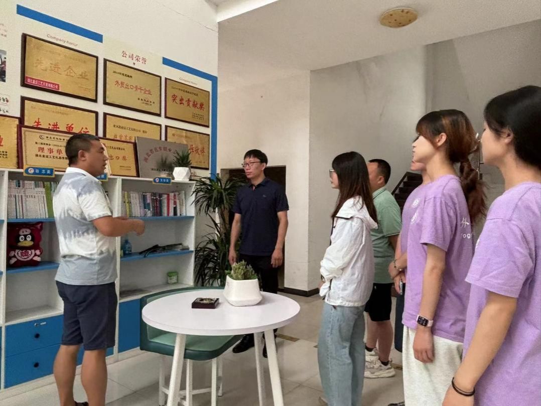随后公司总经理马大明带领实践队成员先后参观了公司的各个车间。在马大明先生的讲解下,杨森老师与其进行了更加深入的交流,他们表示,企业一直专注于更加的人性化管理方式,通过科学的管理、良好的待遇和福利留住人才,同时也希望未来能够进一步拓宽和学校的合作领域,包含智能设备改造,信息化建设,产品包装设计和外贸销售渠道等。对公司进行参观和交流之后,该公司希望本次暑期社会实践队为公司制作针对公司和产品介绍的英文宣传片,团队成员通过进行分工协作,有序开展相关工作。