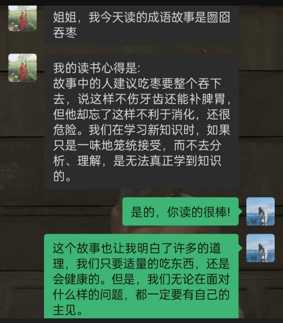 每次中小学生阅读完成后,志愿者们会通过通话、聊天的方式与中小学生们分享各自的读书感受,带领他们在阅读中更好地吸收书中的知识,在读书中学会思考,从书中汲取智慧,把阅读体验转化为个人成长和进步的动力,让阅读成为他们生活的一部分。