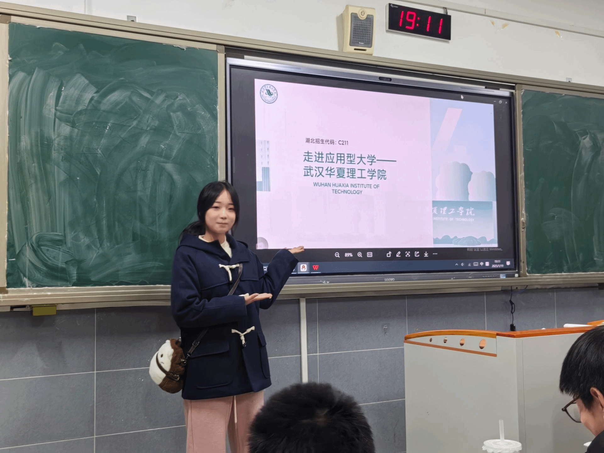 同时,还有关于杜婉婷大一上学期的志愿活动——光谷马拉松。同学们对志愿活动十分感兴趣,图片出来那瞬间吸引了全班的目光。她对志愿活动进行补充,并讲述志愿活动中遇到的小故事。