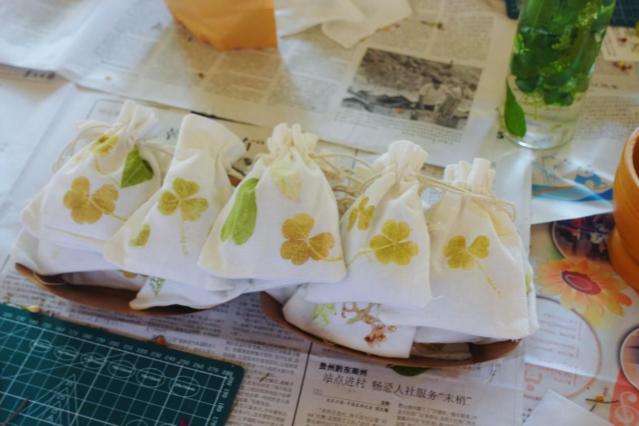 植物拓印环节将自然意趣与非遗智慧巧妙融合,成为活动的另一大亮点。团队精心准备了艾草、薄荷、玫瑰、紫苏等古法香囊的经典原料,这些带着自然气息的植物,无论是脉络清晰的树叶,还是形态雅致的花瓣,都化作了天然的花纹模板。孩子们兴致勃勃地挑选喜爱的植物,将其平整铺在白色香囊布袋上,手持小锤子轻轻敲击,随着清脆的敲击声,植物的汁液逐渐渗透布料,留下独一无二的自然色彩与纹理。