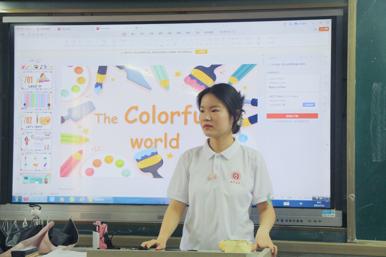 为加深理解记忆,鑫鑫老师设计了丰富互动游戏。“颜色连接”环节中,孩子们寻找对应颜色物品并用英语表述;“颜色接龙”游戏里,大家接力说出带颜色的单词,课堂气氛热烈。孩子们时而专注倾听,时而积极抢答,小脸上写满对知识的渴望。这堂颜色课不仅传授了词汇,更在孩子心中播下热爱英语的种子,让学习如彩虹般绚烂。