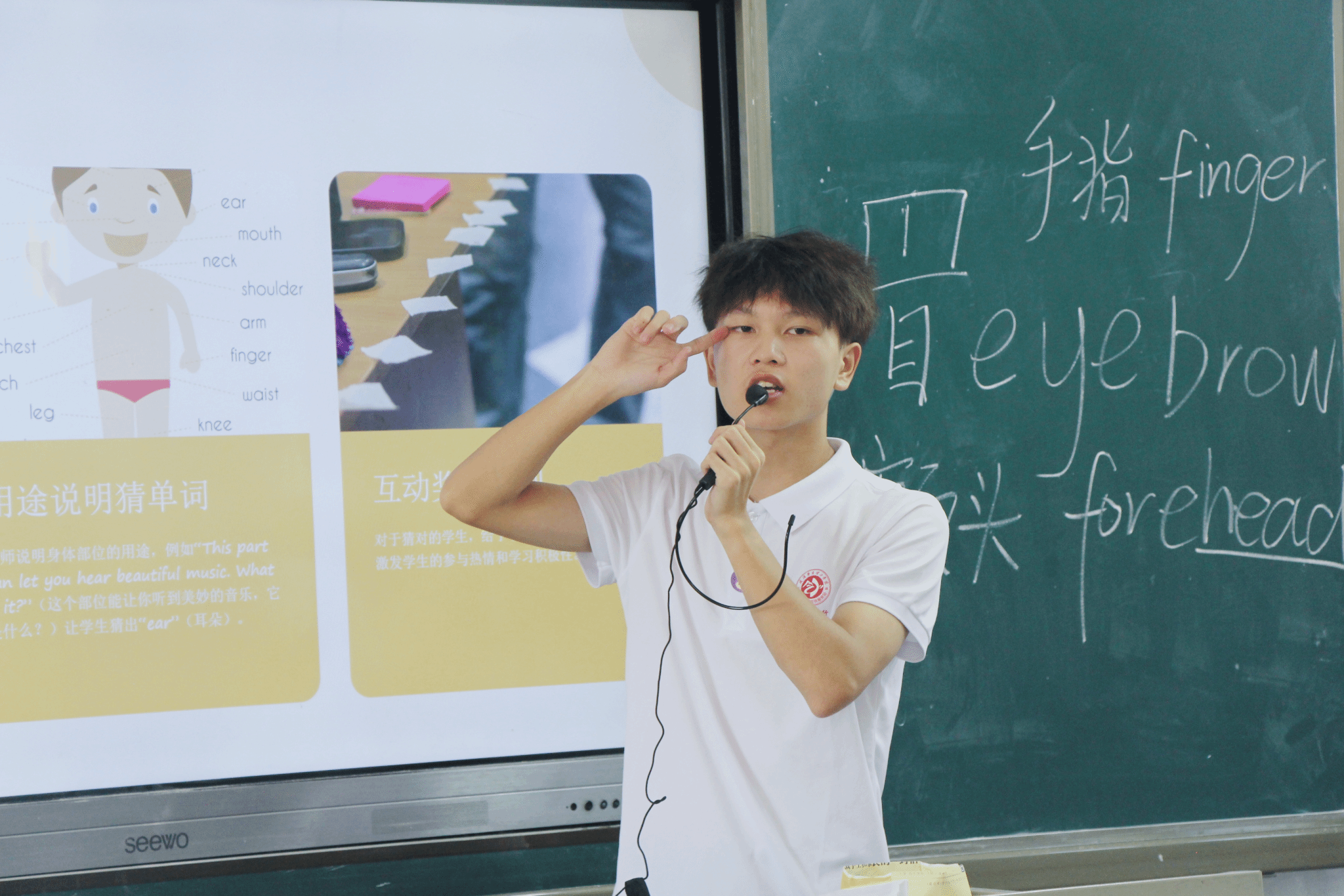 小宇老师的身体部位英语课,在欢快的英文儿歌旋律中拉开序幕。“拍拍你的Head(头)”、“摸摸你的Nose(鼻子)”、“指指你的Eyes(眼睛)!”孩子们凝神细听指令,迅速指向相应部位,笑声与英语词汇在教室中交织回旋。小老师将语言学习融入身体律动,让抽象的词汇变得可触可感,孩子们在游戏之间轻松掌握了丰富的身体英语词汇。