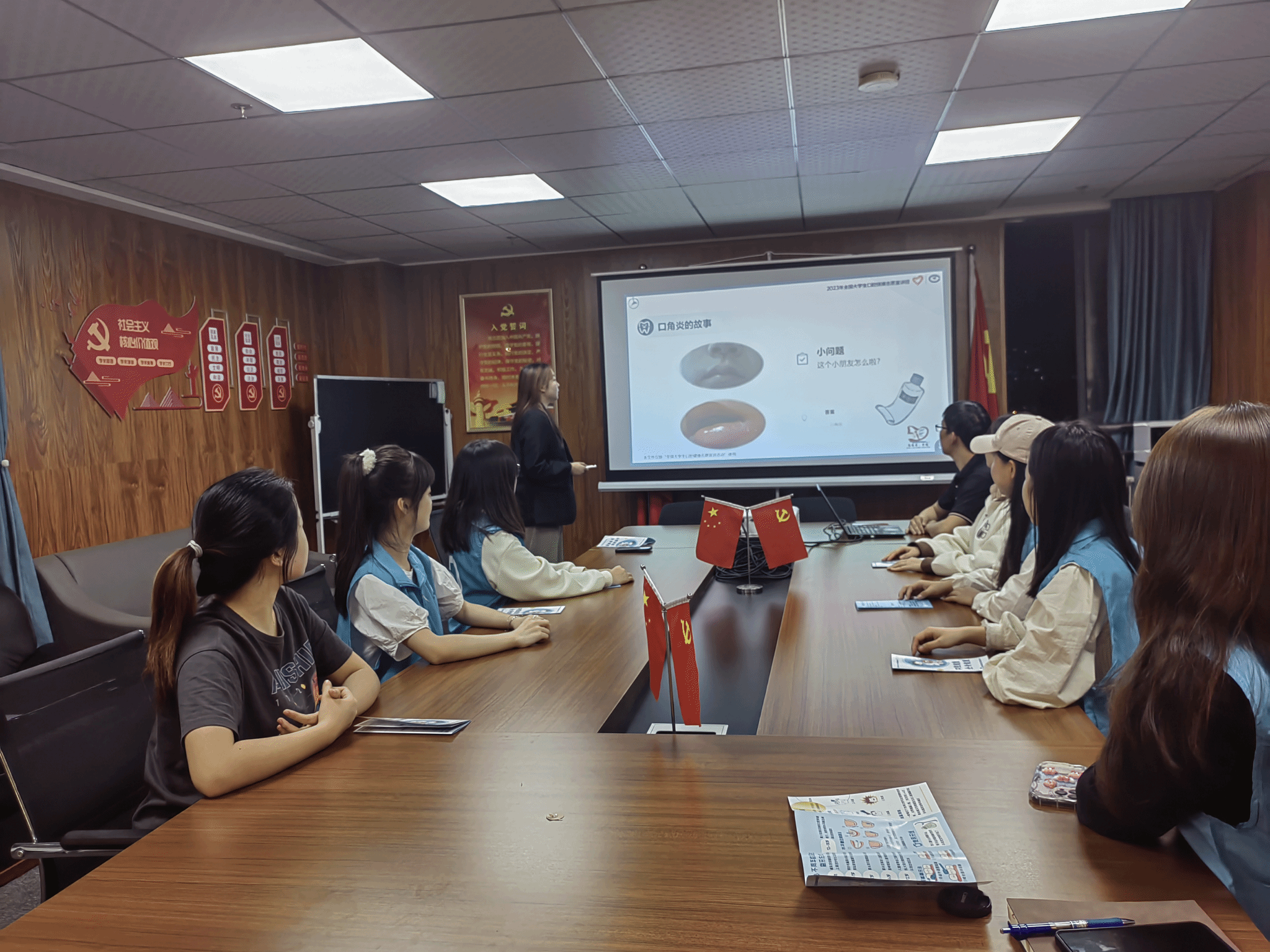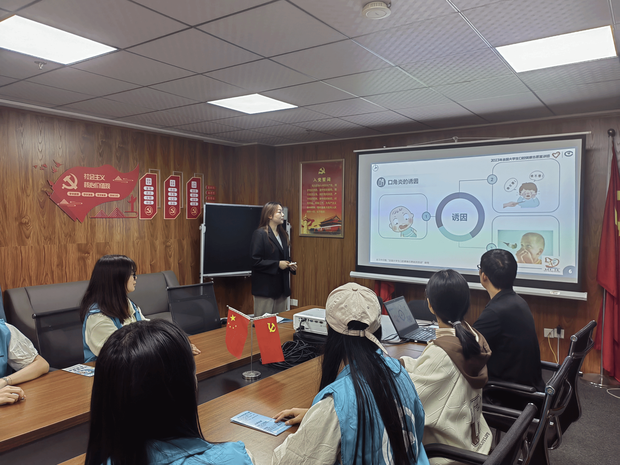 会上,杨咏祺以饱满的热情、专业的知识、形象的语言,为在场听众带来了一场以口角炎为主题的宣讲。她先通过介绍一位小男孩的事例让听众们对口角炎有了初步了解,“口角炎又叫做口角唇炎或是口角糜烂,是上边和下边嘴唇连接的地方,也就是口角的部位出现的各种炎症的总称,常常表现为脱屑掉皮、红肿、疼痛等症状”。接着,她对口角炎的四种类别展开了详细的讲解,她结合幻灯片上的图片和内容,以形象生动的肢体动作帮助听众们能够更好的理解。