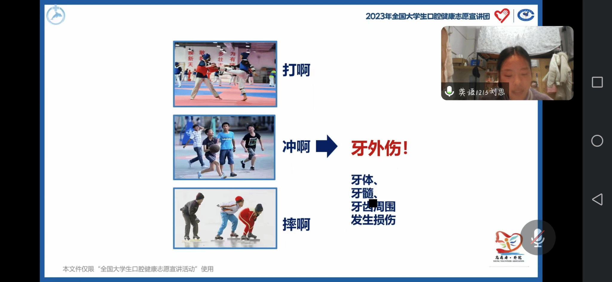 此次宣讲主要从牙外伤的定义、牙外伤的发生、对牙外伤的应对和预防四个方面进行了深入的讲解。刘思首先对牙外伤进行了详细的介绍,她指出,在突然外力的作用下,强大的外力击打到人的面部时,会使牙齿受到冲击,牙体、牙髓以及包绕在牙齿周围的这些部位就可能会出现牙外伤的情况。她强调,一定要重视牙齿问题,只要撞到了牙齿,不论轻重,都建议去医院检查,以免耽误病情。通过生动形象的图片向听众们展示了牙外伤的具体情况,并对这些情况展开讲解。