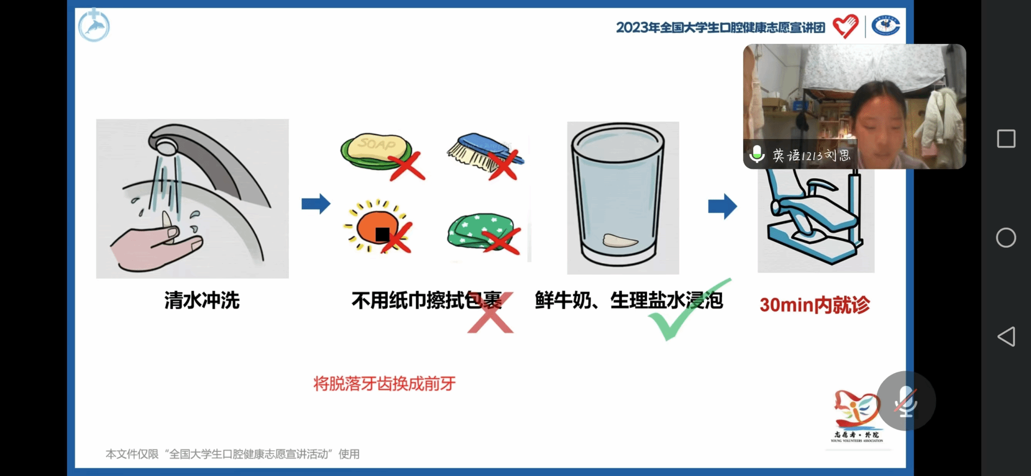 在宣讲会上,刘思还特别着重强调了如何对牙齿进行“急救”这一方面的内容,她指出针对不同的牙外伤有不同的治疗手段,并对开展牙齿“急救”进行了详细的介绍,她表示,掉落的牙齿一定不能受到污染,需要时时保持牙齿的生命力,强调了及时就医的重要性。