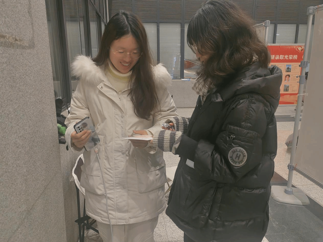在完成一系列的准备活动后,所有参与活动的志愿者于17:50在综合楼门前集合。志愿者们被分为四个小组,由组长和副组长带领志愿者分别前往的综合楼门口和大厅、107-1、104-2、考研教室外四个地点送贺卡和小礼物。进入大厅,就传来了考研学长学姐们的朗朗书声和她们奋斗的身影,志愿者们拿出准备好的贺卡送给他们并祝福他们考试加油,协会的成员们通过摄像记录这些暖心的瞬间。考研的学子们表示他们很开心能够收到同学们的祝福与鼓励,希望在之后的考试过程中稳定发挥,不辜负期盼!