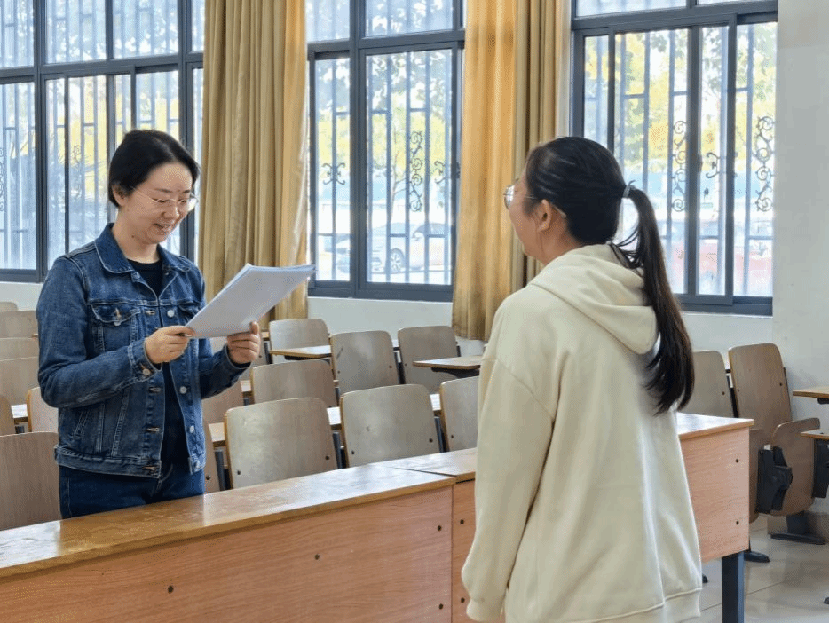 指导老师认真聆听同学们的发言,通过各种提问和考察方式,例如如何提高非英语专业学生早自习英语读背的积极性等,从英语表达能力、教育方法、沟通能力等多方面对面试者进行评分和考量,并给予每位面试者相应的反馈、鼓励和建议。