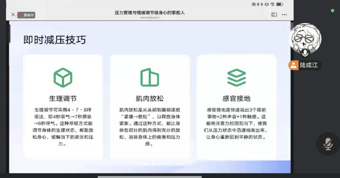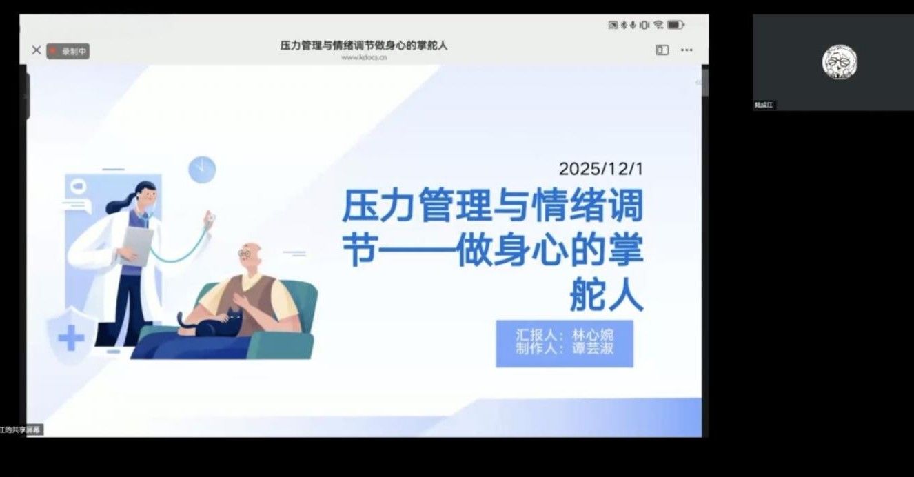 2025年12月1日,外国语学院心理健康协会面向25级各班心理委员,通过腾讯会议开展了以“压力管理与情绪调节——做身心的掌舵人”为主题的线上培训。本次培训由余欣怡同学主讲,旨在帮助心理委员掌握科学方法,帮助同学们正确应对学习生活中的压力。