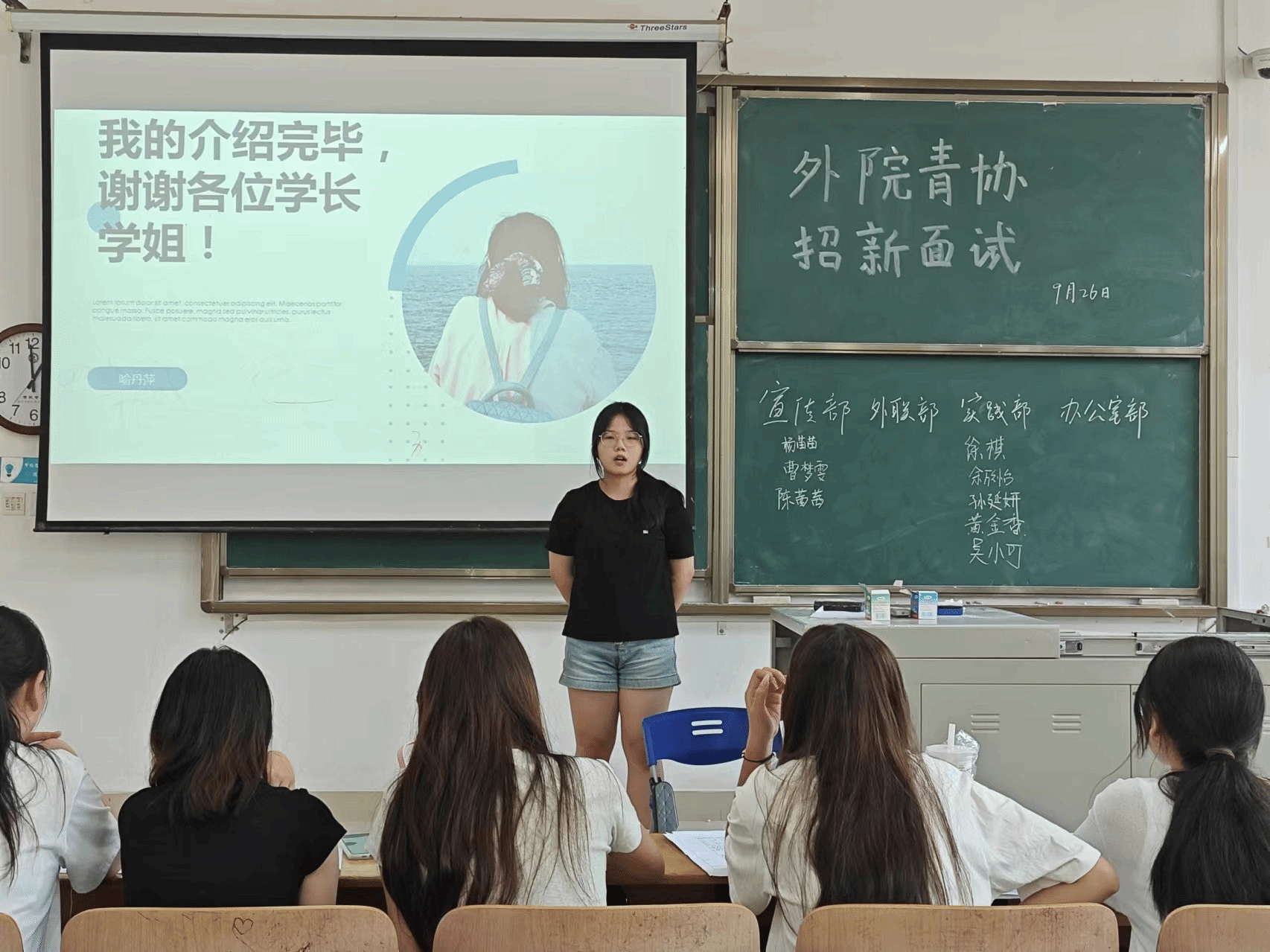 9月23日晚18:30,外国语学院青年志愿者协会在教学楼1-301、1-208正式开展新生招新活动,参与人员有团总支书记杨森,青协会长陈志娟,副会长刘琪以及各部门干部。9月26日中午,青协在教学楼1-102、1-103、1-104、1-105教室组织并开展了面试工作。新生们积极踊跃地报名参与,招新面试进行地如火如荼。