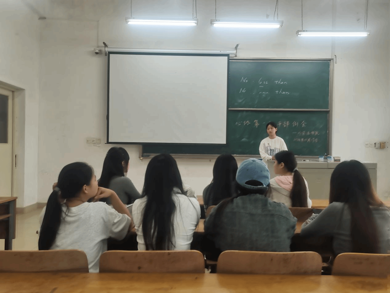 2024年10月17日外国语学院心理健康协会在教学楼1-102教室召开了第一次干部例会,各个部门的部长和副部长均到会参加。