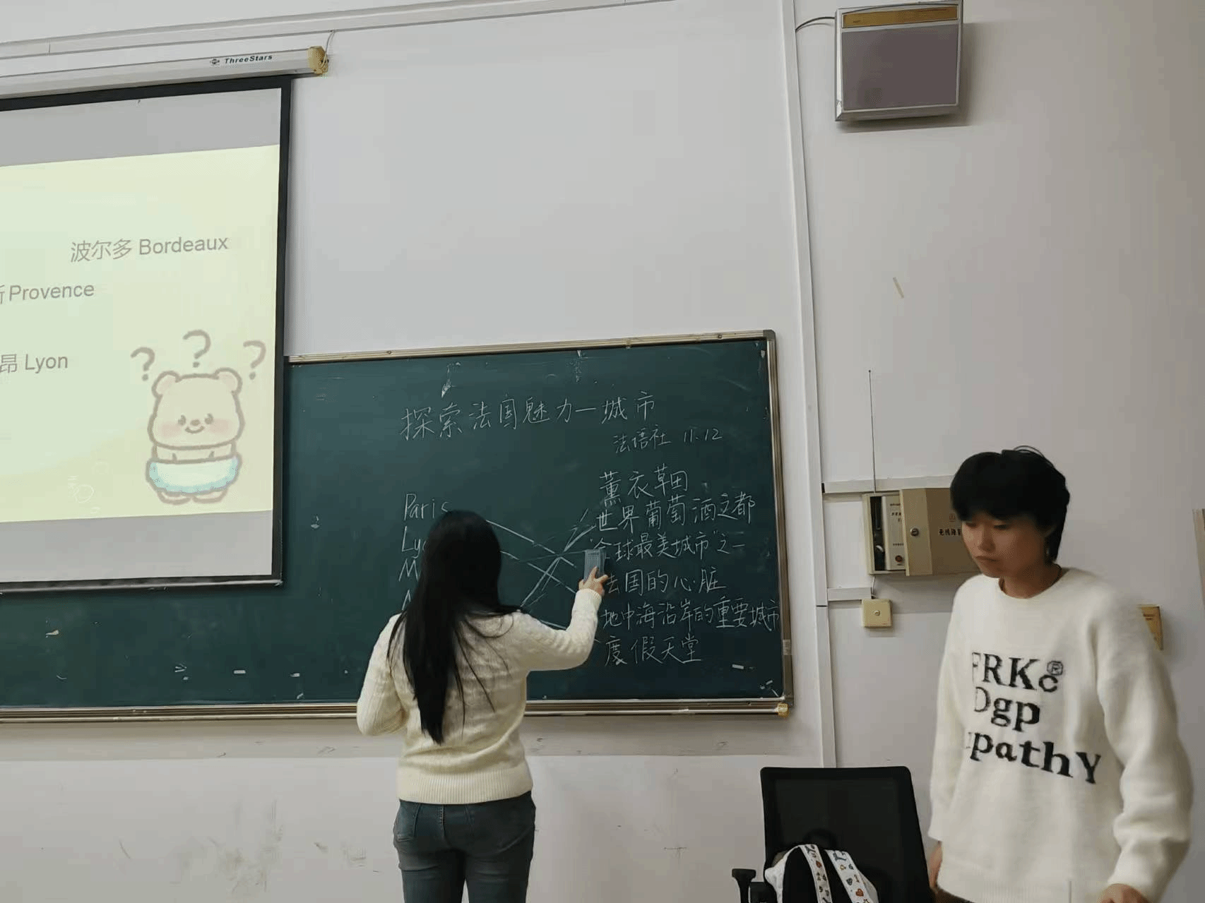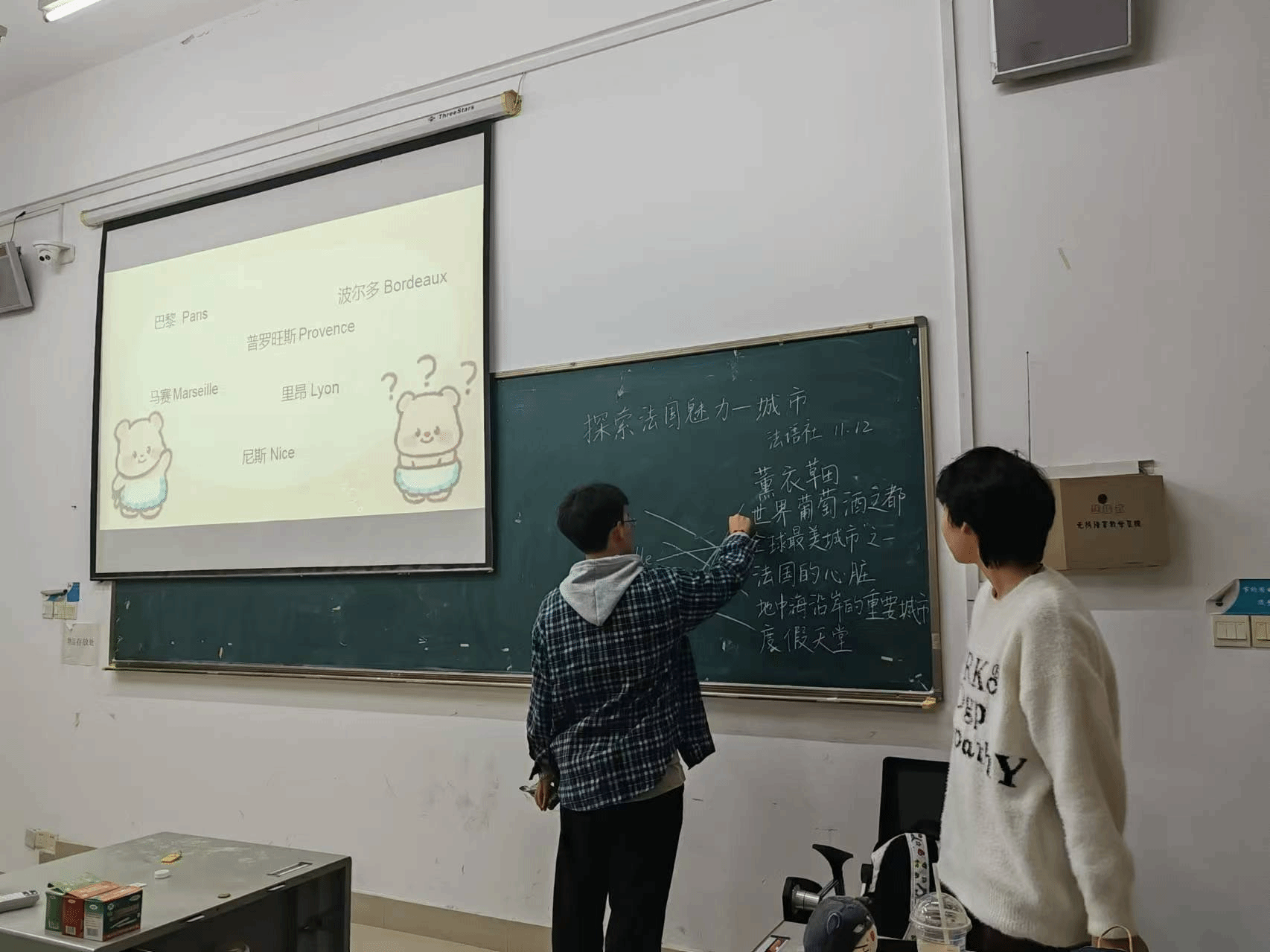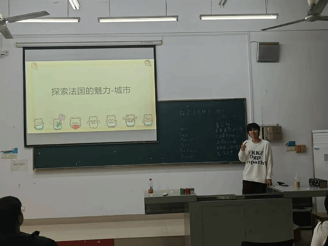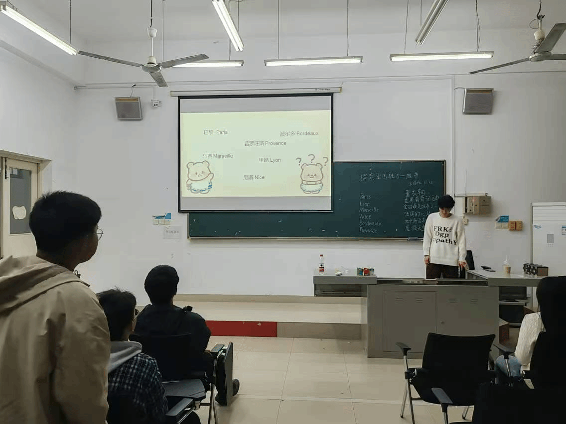 在讲解过程中,成员们还分享了自己对这些城市的感受和体验,有些人分享了知道的法国美食,如鹅肝、法棍、蜗牛等,让同学们更加深入地了解法国的文化和生活。随后的互动环节,同学们积极参与,分享自己对法国城市的印象和向往。有的同学讲述了自己曾对法国的印象看法,有的则表达了对未来去法国探索的期待。