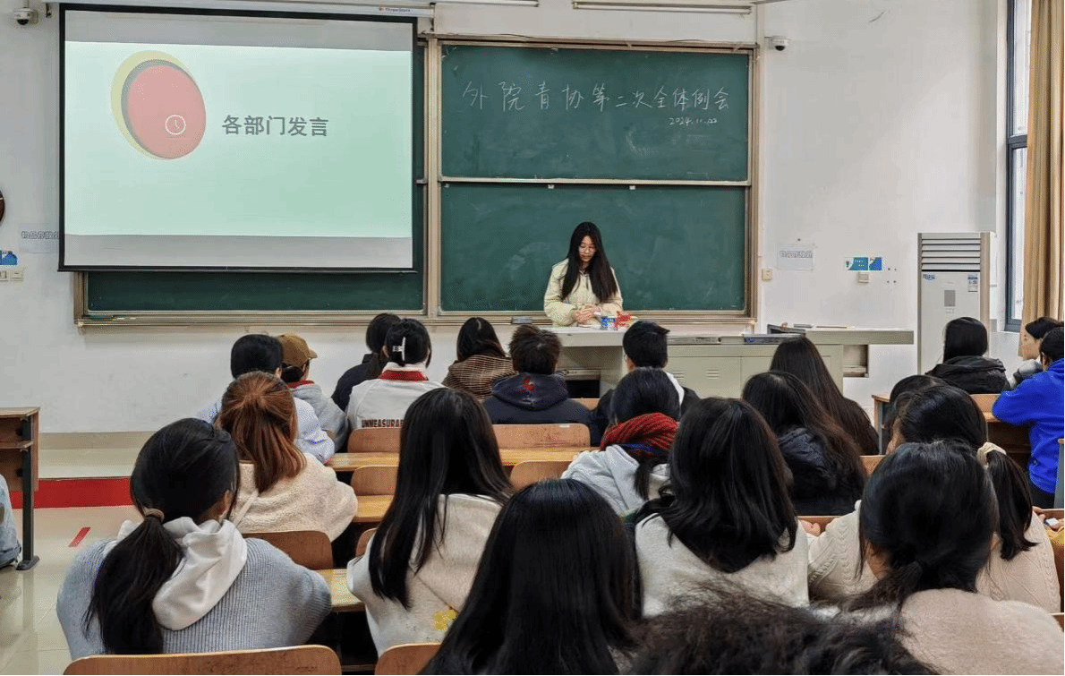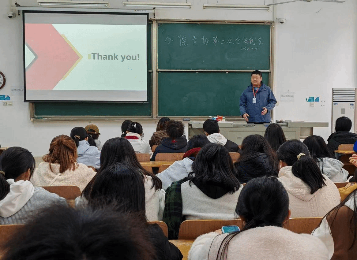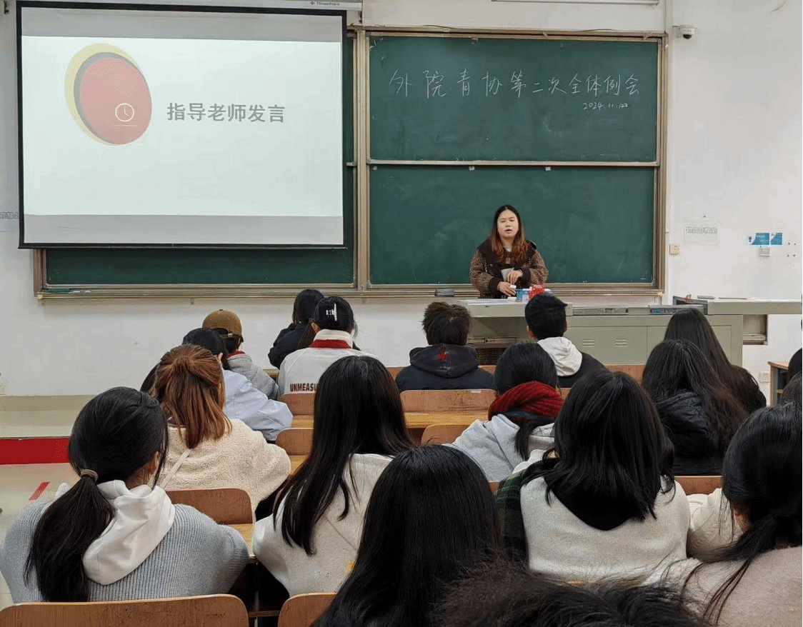 为推动外国语学院青年志愿者协会迈向新高度,实现更优质的志愿服务,2024年11月22日中午12时10分,外国语学院青年志愿者协会在教学楼 1-107 召开例会,协会指导老师王欣佳及协会全体成员共同参与。