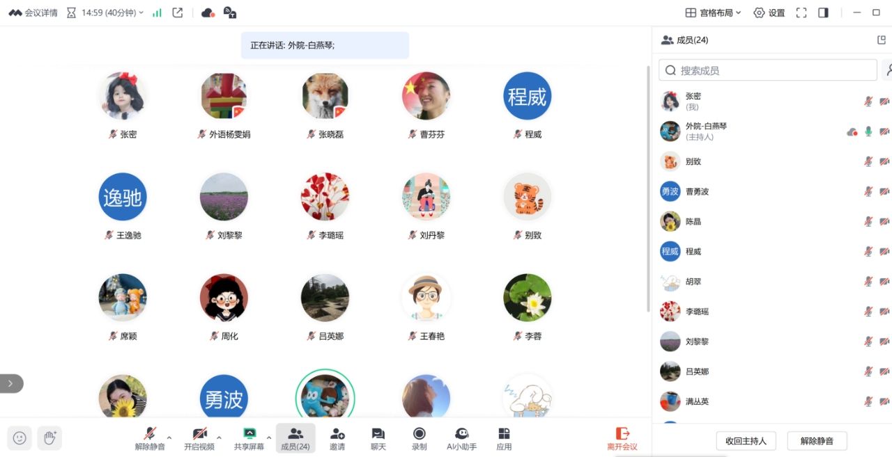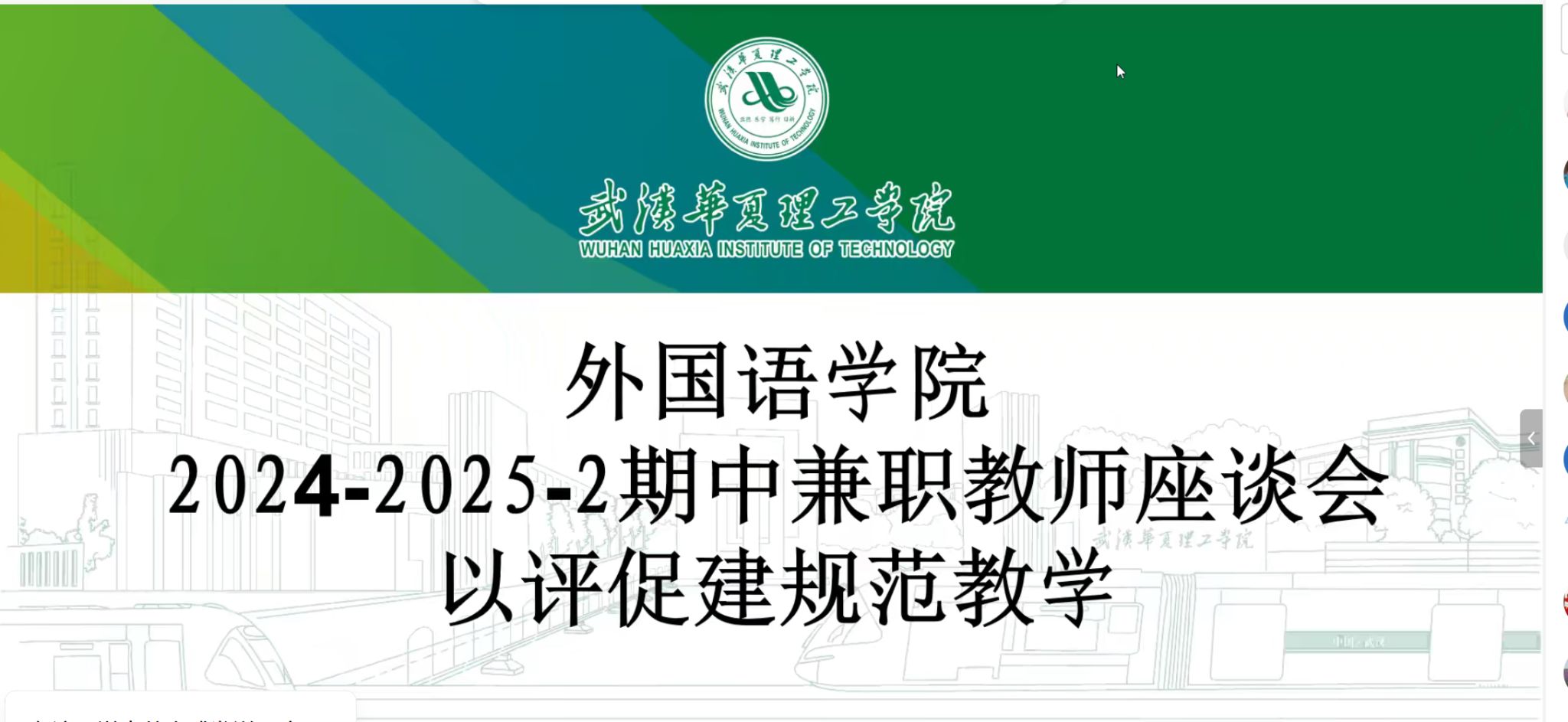 2025年4月23日晚8点,外国语学院通过腾讯会议召开了2024 - 2025 - 2学期兼职教师座谈会。会议由外国语学院副院长白燕琴主持,外国语学院副院长曹勇波,各系部主任,教学办全体成员,全体兼职教师参加了此次会议。