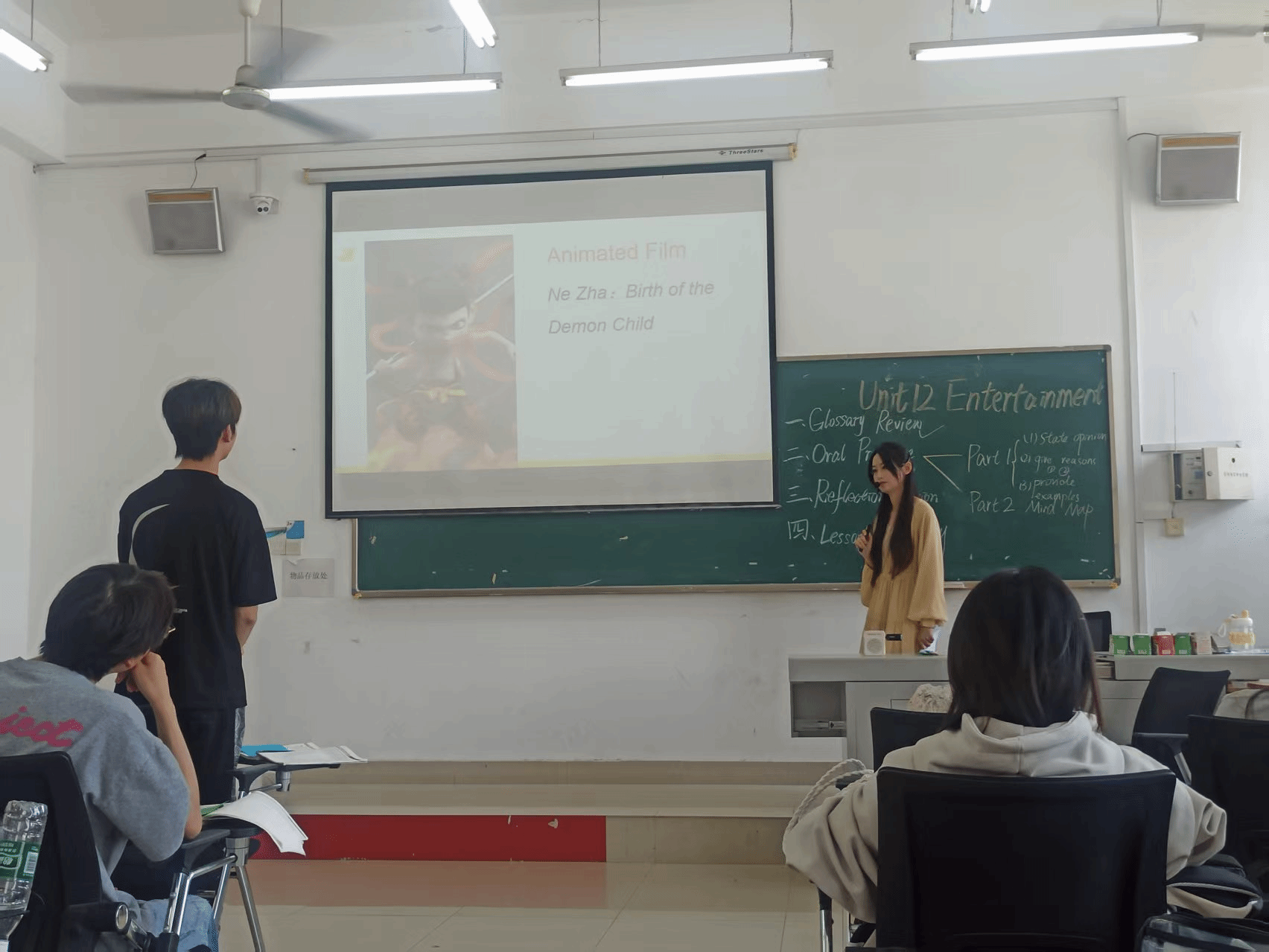 在口语练习环节,张老师借鉴雅思口语问答模式,通过快问快答的形式,引导学生快速组织语言、运用词汇进行表达,很好地锻炼了学生的即时反应能力和口语表达能力,使学生逐渐适应在交流中准确输出。话题讨论环节,张老师引入思维导图,鼓励学生围绕“中国娱乐文化”展开联想并自主绘制思维导图。课堂聚焦《哪吒之魔童闹海》、《黑神话:悟空》等富含中国元素的娱乐项目,学生们积极参与讨论,用英语分享自己的见解,不仅提升了英语表达能力,还加深了对传统文化的理解,增强了文化自信。整堂课师生互动频繁,学生参与度高,展现出良好的课堂效果。