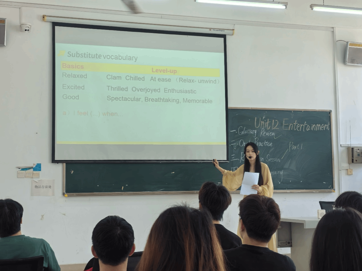 课堂上,张梓淇老师以“娱乐活动中的中国元素”为主线,精心设计教学环节。课程开场,张老师采用“拼图猜词”的方式帮助学生复习娱乐相关词汇,有效活跃了课堂气氛,让学生在趣味中巩固知识,为后续的学习做好铺垫。