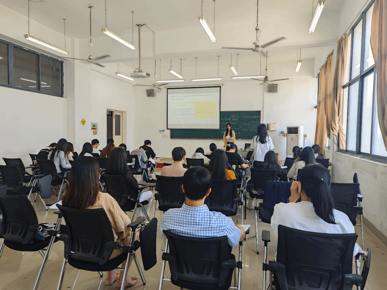 4月28日下午2点,商务英语系在3-502教室开展了一场随堂磨课活动。刘沛院长、白燕琴副院长以及商英系全体教师参与了本次活动。新入职的张梓淇老师带来了以“Entertainment”为主题的一堂英语口语课。