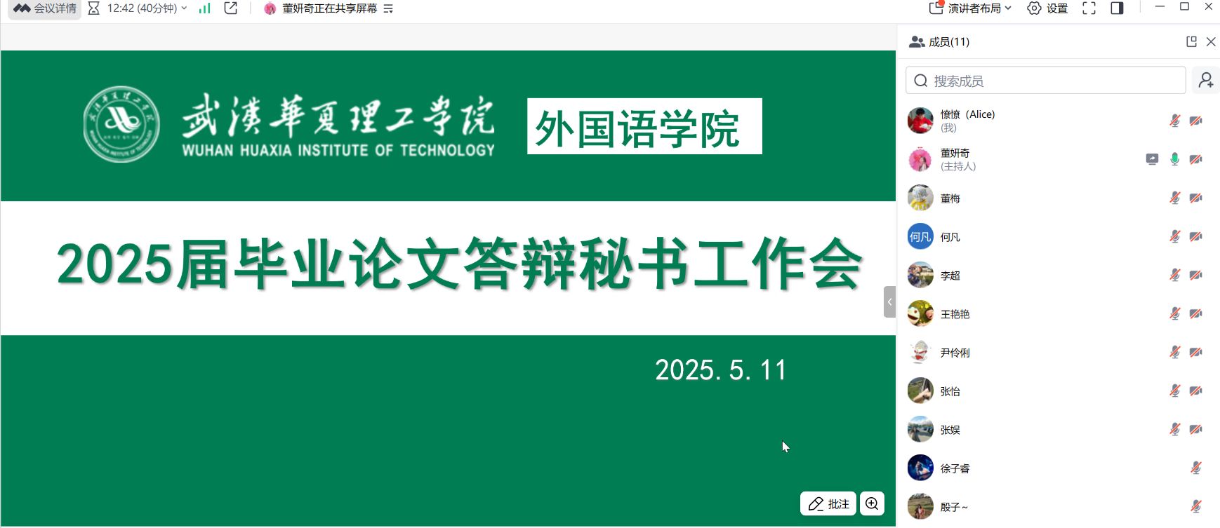 2025 年 5 月 11 日,晚上8点,外国语学院毕业论文工作组通过腾讯会议召开了 2025 届毕业论文答辩秘书工作会。此次会议由董妍奇老师和张憭憭老师主持,所有参加本次毕业论文的答辩秘书均参加了此次会议。会议旨在规范毕业论文答辩流程,确保答辩工作顺利开展。